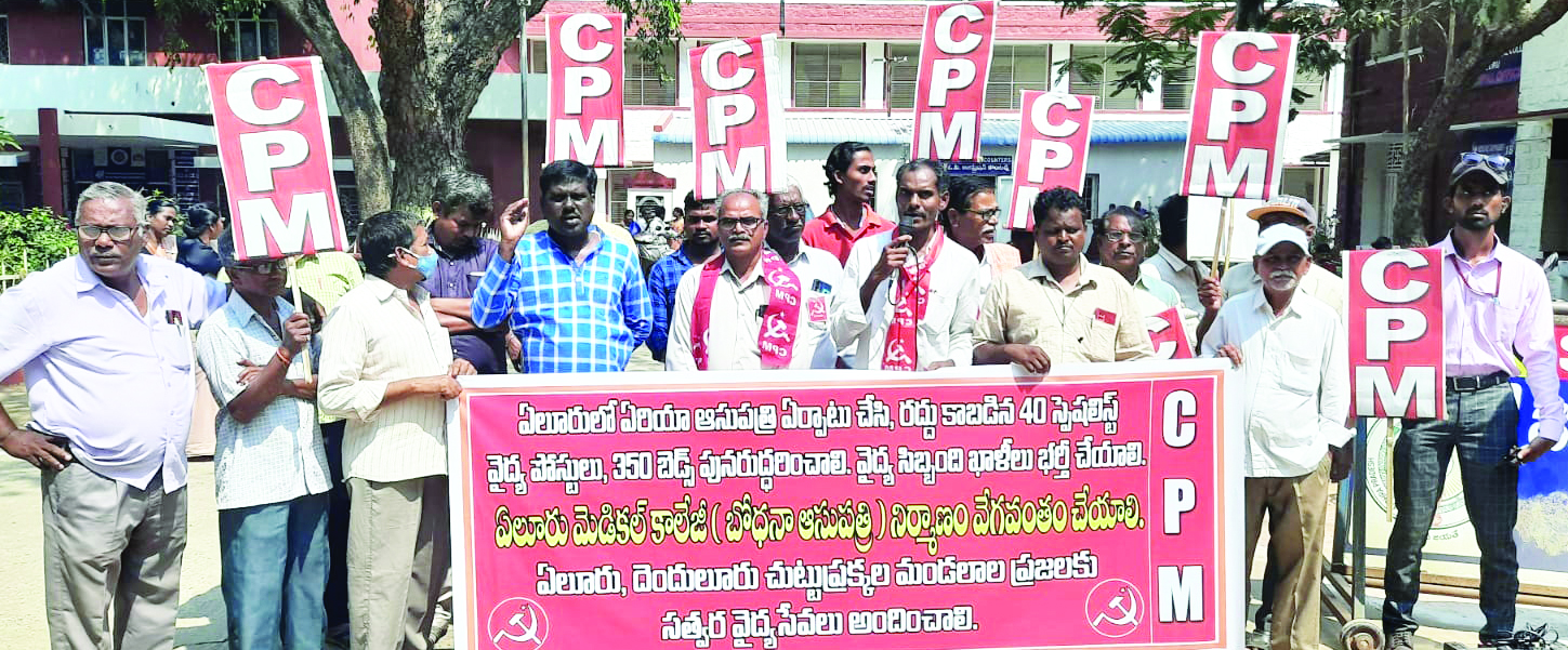 ఏలూరు ఏరియా ఆసుపత్రి కొనసాగించి, జిల్లా ఆసుపత్రిలో రద్దు చేసిన 40 వైద్య పోస్టులు, 350 బెడ్స్ను పునరుద్ధరించాలని డిమాండ్ చేస్తూ సిపిఎం నగర కమిటీ ఆధ్వర్యంలో సోమవారం స్థానిక జిల్లా ఆసుపత్రి వద్ద ధర్నా నిర్వహించారు. ఈ సందర్భంగా సిపిఎం జిల్లా కార్యదర్శి ఎ.రవి మాట్లాడుతూ ఏలూరుకు మెడికల్ కాలేజీ రావడం సంతోషమేనని, ఆ పేరుతో ఏలూరులో ఉన్న జిల్లా ఆసుపత్రి వైద్య సేవలు రద్దు చేయడం అన్యాయమని అన్నారు. కేంద్ర, రాష్ట్ర ప్రభుత్వాలకు ప్రజల వైద్యంపై శ్రద్ధ లేదని విమర్శించారు. కరోనా సమయంలో కేంద్రంలో బిజెపి మంత్రులు, నాయకులు గోమూత్రం తాగితే కరోనా తగ్గుతుందని ప్రచారం చేశారని గుర్తు చేశారు. చివరకు వారికి కరోనా వస్తే ఆసుపత్రుల్లో చేరి చికిత్స పొందారన్నారు. వైద్య రంగానికి కేంద్రంలోని బిజెపి ప్రభుత్వం కనీసం ఐదు శాతం నిధులు కేటాయించాలని మేధావులు, ప్రతిపక్ష పార్టీలు కోరుతుంటే పట్టించుకోవడం లేదని విమర్శించారు. ముఖ్యమంత్రి జగన్ ప్రజా సమస్యలన్నీ నవరత్నాలతోనే పరిష్కారమవుతాయని నమ్మబలుకుతున్నారని అన్నారు. విద్య, వైద్యం వంటి ప్రజల మౌలిక సమస్యలపై ప్రభుత్వం దృష్టి పెట్టాలని ఆయన డిమాండ్ చేశారు. ఏలూరు జిల్లాలో 21 లక్షలు జనాభా ఉందని, ఆ మేరకు జిల్లాలో ఆ ఏరియా ఆసుపత్రులు లేవని అన్నారు. 18 లక్షలు జనాభా ఉన్న పశ్చిమగోదావరి జిల్లాలో ఐదు ఏరియా ఆసుపత్రులుంటే, ఏలూరు జిల్లాలో మూడు ఆసుపత్రులే ఉన్నాయన్నారు. ఇప్పుడు ఏలూరులో వైద్య సేవలందిస్తున్న జిల్లా ఆసుపత్రి రద్దు కావడంతో పేదలకు సత్వర వైద్య సేవలు అందడం లేదన్నారు. జిల్లాలో ఏలూరుతోపాటు దెందులూరు, కైకలూరు ప్రాంతాల్లో కూడా ఏరియా ఆసుపత్రులు ఏర్పాటు చేయాలని ఆయన డిమాండ్ చేశారు. ఏలూరు మెడికల్ కాలేజీలో అన్ని స్పెషలిస్ట్ వైద్య యూనిట్లకు అనుమతులు రాలేదని, వెంటనే అనుమతులు ఇవ్వాలని డిమాండ్ చేశారు. మెడికల్ కాలేజీ పనులు వేగవంతం చేసి ప్రజలకు మెరుగైన వైద్యం అందించాలని కోరారు. సిపిఎం నగర కార్యదర్శి పళ్లెం కిషోర్ మాట్లాడుతూ మెడికల్ కళాశాల అందుబాటులోకి రాకుండా ఏలూరు జిల్లా ఆసుపత్రిలో 40 స్పెషలిస్ట్ వైద్య పోస్టులు, 350 బెడ్స్ రద్దు చేయడం అనాలోచిత చర్యని అన్నారు. ఏలూరు ఆసుపత్రిలో రోగులకు నిర్వహించాల్సిన స్కానింగ్, ఇతర పరీక్షలకు బయట ల్యాబ్లకు పంపకుండా అన్నీ ఆసుపత్రిలోనే ఉచితంగా చేయాలని డిమాండ్ చేశారు. కార్యక్రమంలో సిపిఎం నాయకులు వి.సాయిబాబు, బి.జగన్నాథరావు, జి.రవికిషోర్, వివివిఎన్.ప్రసాద్, జె.గోపి, మంచెళ్ల ఇసాక్, ఎస్.సత్యనారాయణ, ఏసుబాబు, చల్ల పైదియ్య, నర్సింహమూర్తి, రుక్మనందరావు, రాజేష్, ప్రభు, మీసాల సత్యం పాల్గొన్నారు
