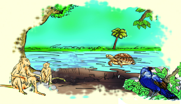 అనగనగా ఒక చెరువు ఒడ్డున ఒక మర్రిచెట్టు ఉంది. చెట్టు మీద కోతి, కోకిల ఉండేవి. చెరువులో ఒక తాబేలు ఉండేది. చిన్నప్పుడు అవి మూడూ కలిసి చెరువు గట్టు మీద ఆడుకునేవి. పాడుకునేవి. కోతి తన అమ్మానాన్నలతో ఎక్కువగా ఉండేది. కోకిల, తాబేలుకు అమ్మానాన్నలు లేరు. దాంతో అవి ఒంటరిగా ఉండేవి.