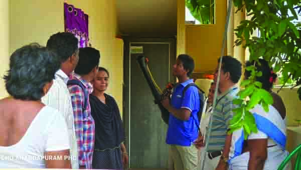 డెంగీ కేసు నమోదైన ఇంటి వద్ద స్ప్రే చేయిస్తున్న వైద్య సిబ్బంది