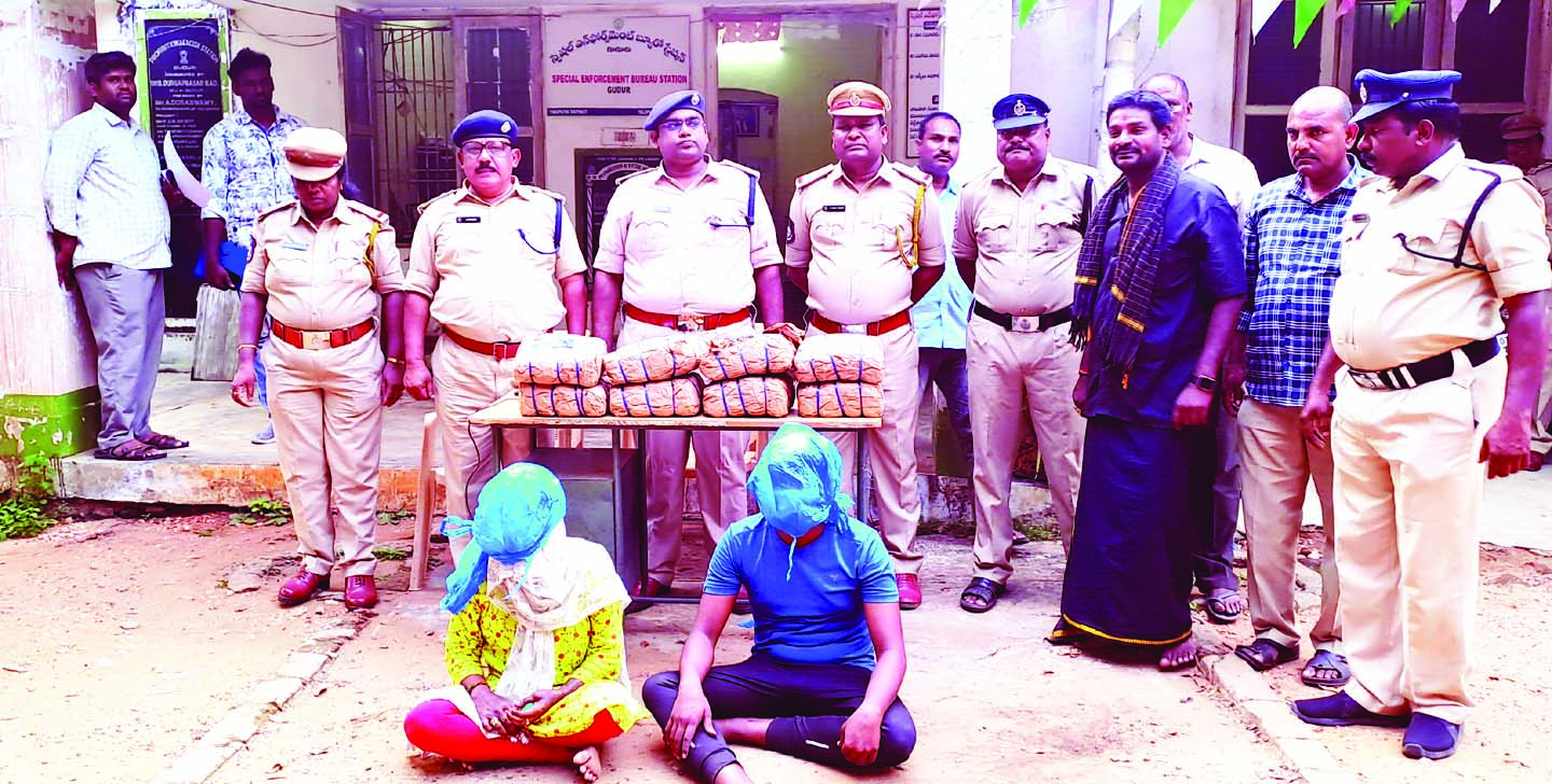 ప్రజాశక్తి -గూడూరు: తిరుపతి జిల్లా ఎస్పి పి. పరమేశ్వర్ రెడ్డి మరియు తిరుపతి జిల్లా డి ఎస్ ఇ ఓ ( ఏఎస్పి, సెబ్ ) అధికారి అయిన ఏ . రాజేంద్ర ఆదేశాల మేరకు ఈరోజు అనగా ఉదయం 3 గంటల నుంచి చిల్లకూరు మండల పరిధిలోని బూధనం టోల్ ఫ్లాజా వద్ద ఎన్ హెచ్ 16 పైన గూడూరు సెబ్ టీమ్ వాహనాలను తనిఖీ చేశారు. ఈ వాహనాల తనిఖీలో తణుకు డిపో కి చెందిన, తణుకు నుండి తిరుపతికి వెళుతున్న ఎపి 03 5622నెంబరు గల ఏపీఎస్ ఆర్టీసి సూపర్ లగ్జరీ బస్సులో ప్రయాణిస్తున్న గంజాయి కలిగిన తమిళనాడు మధురై కి చెందిన ఇద్దరు వ్యక్తులను అరెస్టు చేసి, వారి నుండి 16 కేజీ ల గంజాయిని స్వాధీనం చేసుకున్నారు. నిందితులు మహేష్ తండ్రి చెల్లదురై, వయస్సు 23 ఏళ్లు వుంటుందని మధురైకి చెందిన వ్యక్తి అని తెలిపారు. ముత్తు అమ్మాల్, భర్త సత్యమూర్తి, వయస్సు 38 సంవత్సరాలు వుంటుంది. మధురైకి చెందిన వ్యక్తులు విచారణలో తేలింది. మధురై కి చెందిన మహేష్ కు స్నేహితుడైన శివ అనే వ్యక్తి వీరిద్దరిని గంజాయి తీసుకురమ్మని విజయవాడ ఏపీఎస్ఆర్టీసీ బస్టాండ్కు పంపాడు. శివకు తెలిసిన వ్యక్తి ఈ 16 కేజీల గంజాయిని వీరికి విజయవాడ బస్టాండ్ లో ఇచ్చాడు. గంజాయిని తెచ్చి ఇచ్చినందుకు శివ వీరికి రూ.5వేలు చొప్పున ఇచ్చాడు. శివ ఈ గంజాయిని ఒక్కో కేజీ 20 వేల రూపాయల చొప్పున మొత్తం రూ.3,20,000ల కు మధురై చుట్టుపక్కల ప్రాంతాలలో అమ్ముతాడు. ఈ కేసుతో సంబంధం ఉన్న అందరినీ త్వరలోనే అరెస్టు చేస్తామని పోలీసులు తెలిపారు. రెండు సంవత్సరాల కాలంలో గూడూరు సెబ్ టీమ్ గంజాయి నేరాలపై విస్తతంగా దాడులు నిర్వహించి,46 కేసులు నమోదు చేసి, 96 మందిని అరెస్టు చేశారు. 543 కేజీల గంజాయిని, రెండు కార్లను సీజ్ చేశారు. గంజాయి ఖిల్లాగా పేరుబడ్డ గూడూరు పట్టణంలోని అరుంధతిపాలెంలో విస్తతంగా దాడులు నిర్వహించి, అక్కడ గంజాయిని పూర్తిగా నియంత్రించామని తెలిపారు. ఈ దాడులలో గూడూరు సెబ్ టీమ్ సీఐ ,పి విజరు కుమార్, ఎస్ ఐ , ఏ శేషమ్మ, హెచ్ ఎం కిరణ్ సింగ్ పి . రమేష్, వి.ఎన్ ప్రసాద్, ఎం . కష్ణ, ఎస్ కె భాష,టీజి ఆనందబాబు, రామ్ ప్రసాద్ పాల్గొన్నారు.