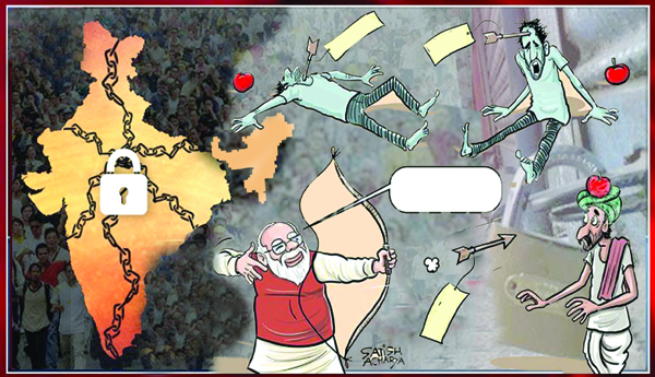ఈ రెండో దఫాలో మరింత క్రూరంగా, ఒక పథకం ప్రకారం ప్రజాస్వామిక హక్కుల పైన, పౌర హక్కుల పైన, ప్రజల జీవన పరిస్థితుల పైన దాడులు జరుగుతున్నాయి. రాజ్యాంగం లోని 370 అధికరణ రద్దు, రాష్ట్రాలకు జిఎస్టి పరిహారాన్ని ఎగగొట్టి కేంద్రం మాట తప్పిన వైనం, వివక్షా పూరితమైన పౌరసత్వ చట్ట సవరణ, మూడు వ్యవసాయ చట్టాలు, వందేళ్ళు పోరాడి కార్మికులు సాధించుకున్న హక్కులను కాలరాసిన తీరు కొన్ని కొట్టొచ్చినట్టు కనపడే దృష్టాంతాలు. మార్చి నెలలో కేవలం నాలుగు గంటల వ్యవధి లోనే లాక్డౌన్ విధించి లక్షలాది వలస కార్మికులను నడిరోడ్డు పైకి నెట్టారు. నిరాధారంగా నిలిచిన శ్రామిక ప్రజలకు సహాయం అందించడంలో ఏ ఇతర బూర్జువా ప్రభుత్వాలూ ప్రదర్శించనంత పిసినారితనాన్ని మోడీ ప్రభుత్వం ప్రదర్శించింది. ఈ ప్రభుత్వం ఎంత బాధ్యతారహితంగా, ఎంత అమానవీయంగా వ్యవహరించిందో చెప్పడానికి ఇవి చాలు. నిజానికి ఈ మహమ్మారిని సాకుగా చూపించి శాంతియుతంగా పౌరసత్వ చట్ట సవరణకు వ్యతిరేకంగా ఆందోళన చేస్తున్న ప్రజలను మూకుమ్మడిగా అరెస్టులు చేసింది. వారిని భయభ్రాంతులను చేసింది. ఎటుతిరిగీ వారు కరోనా విజృంభణ అనంతరం తమ ఆందోళనలను నిలిపివేసి వుండేవారు.