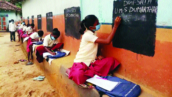 జార్ఖండ్ రాష్ట్రంలో ఓ ప్రధానోపాధ్యాయుడు వినూత్న ఆలోచనతో కోవిడ్ నిబంధనలు పాటిస్తూ పిల్లలకు చదువు చెబుతున్నారు. డుమ్కా జిల్లాలోని మారుమూల గిరిజన గ్రామం దుమార్తర జిల్లా కేంద్రానికి 40 కిలోమీటర్ల దూరంలో ఉంది. ఆ ఊళ్లోని పాఠశాలలో సుమారు 290 మంది విద్యార్థులు చదువుకుంటున్నారు. కోవిడ్ కారణంగా పాఠశాల తెరుచుకోకపోవడంతో పిల్లలు చదువులో వెనకబడుతున్నారని ప్రధానోపాధ్యాయుడు సపన్ పట్రాలేఖ్ గ్రహించారు. విద్యార్థుల ఇళ్ల దగ్గరే పాఠాల బోధనకు అధికారులతో మాట్లాడి, వారిని ఒప్పించారు.