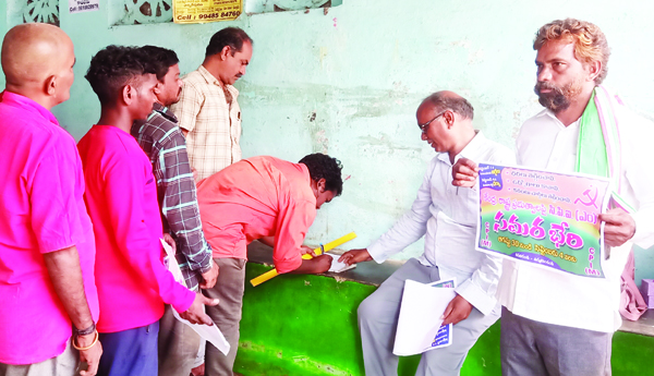 ప్రజాశక్తి-కురుపాం : కేంద్ర ప్రభుత్వం అవలంబిస్తున్న ప్రజా వ్యతిరేక విధానాలపై మంగళవారం మండల కేంద్రంలో గల రావాడ జంక్షన్ వద్ద సిపిఎం మండల కార్యదర్శి ఎం.శ్రీనివాసరావు ఆధ్వర్యంలో జరుగుతున్న సంతకాల సేకరణ కార్యక్రమానికి ముఖ్యఅతిథిగా సిపిఎం జిల్లా కార్యదర్శి రెడ్డి వేణు హాజరయ్యి సంతకాలు సేకరించారు. ఈ సందర్భంగా ఆయన మాట్లాడుతూ కేంద్రంలో మతోన్మాద మోడీ ప్రభుత్వం నిరుద్యోగ సమస్యలను పరిష్కరించడంలో ధరలను అదుపు చేయడంలో ఘోరంగా విఫలమైందని విమర్శించారు. ఈ మతోన్మాద ప్రభుత్వ ప్రజా వ్యతిరేక విధానాలు కోసమే సిపిఎం సమరభేరి మోగిస్తుందని, దానిలో భాగంగా సంతకాలు సేకరణ సెప్టెంబర్ 1న గ్రామ సచివాలయాల్లో ధర్నా వినతుల సమర్పణ, సెప్టెంబర్ 3న నిరుద్యోగ వ్యతిరేక దినం, సెప్టెంబర్ 4న మండల కార్యాలయంలో వద్ద ధర్నా నిర్వహించామన్నారు. ఈ కార్యక్రమానికి పెద్ద ఎత్తున నిరుద్యోగ యువత పాల్గొని జయప్రదం చేయాలని పిలుపునిచ్చారు. కార్యక్రమంలో సిపిఎం నాయకులు ఎన్.సింహాచలం, గిరిజన యువత, ఆటో కార్మికులు పాల్గొన్నారు.
