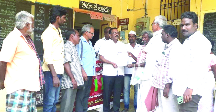 నిబంధనలు సడలించి రైతుల వద్ద నుంచి ధాన్యం కళ్లాల నుంచే కొనుగోలు చేయాలని వ్యవసాయ కార్మిక సంఘం రాష్ట్ర కార్యదర్శి ఎ.రవి కోరారు. స్థానిక తహశీల్దార్ కార్యాలయం వద్ద శనివారం కౌలురైతు సంఘం మండల కమిటీ ఆధ్వర్యంలో ధర్నా నిర్వహించారు. అనంతరం తహాశీల్దార్ కె.శ్రీనివాస్కు వినతిపత్రం అందచేశారు. ఈ సందర్భంగా రవి మాట్లాడుతూ మండలంలో సార్వా ధాన్యం కోతలు జరుగుతున్నాయని, ప్రభుత్వ నిబంధనలు రైతులకు ఇబ్బందికరంగా ఉన్నాయన్నారు. విక్రయించిన ధాన్యానికి రైతులకు నాలుగైదు నెలల వరకూ సొమ్ము ఇవ్వకపోవడం బాధాకరమన్నారు. ఈ సీజన్లోనైనా ధాన్యం విక్రయించిన పది రోజుల్లో రైతుల ఖాతాల్లో సొమ్ము జమ చేయాలని కోరారు. ఈ కార్యక్రమంలో వ్యవసాయ కార్మిక సంఘం రాష్ట్ర కమిటీ సభ్యులు మురాల రాజేష్, జిల్లా సహాయ కార్యదర్శి ఎస్.మహాంకాళిరావు, కౌలురైతు సంఘం జిల్లా నాయకులు ఉల్లంకి నాంచారయ్య, మండల కార్యదర్శి చిన్నం మాధవ, నాయకులు దాకరపు నాగేశ్వరరావు, గద్దె అనిల్ తదితరులు పాల్గొన్నారు.