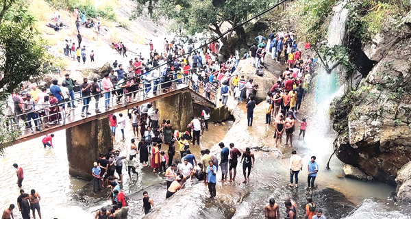 జలపాతం వద్ద పర్యాటకులు