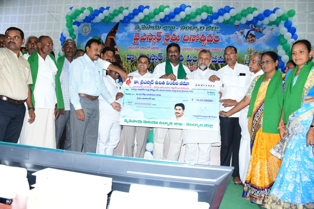 కర్షకులకు అండగా వైసిపి ప్రభుత్వం నిలుస్తుందని జిల్లా పరిషత్ చైర్మన్ ఎర్రబోతుల పాపిరెడ్డి తెలిపారు. శనివారం రైతు దినోత్సవ సందర్భాన్ని పురస్కరించుకొని రాష్ట్ర ముఖ్యమంత్రి వైఎస్ జగన్ మోహన్ రెడ్డి అనంతపురం జిల్లా కళ్యాణదుర్గంలో వైఎస్ఆర్ ఉచిత పంటల బీమా పథకం ద్వారా వరుసగా నాల్గవ ఏడాది 2022 ఖరీఫ్ పంట నష్టపోయిన రాష్ట్రంలోని 10.20 లక్షల మంది రైతులకు రూ.1,117.21 కోట్ల బీమా పరిహార మొత్తాన్ని కంప్యూటర్ బటన్ నొక్కి నేరుగా జమ చేశారు. ఈ కార్యక్రమాన్ని నంద్యాల కలెక్టరేట్లోని వైయస్సార్ సెంటినరీ హాల్లో లైవ్ ద్వారా జిల్లా పరిషత్ చైర్మన్ ఎర్రబోతుల పాపిరెడ్డి, ఎమ్మెల్సీ ఇసాక్ భాషా, జిల్లా వ్యవసాయ సలహా మండలి చైర్మన్ వంగాల భరత్ కుమార్ రెడ్డి, జిల్లా వ్యవసాయ శాఖ అధికారి మోహనరావు, జిల్లా ఉద్యాన శాఖ అధికారి నాగరాజు, పట్టు పరిశ్రమ అధికారి పరమేశ్వరి తదితరులు వీక్షించారు. అంతకుముందు వైఎస్ రాజశేఖర్ రెడ్డి చిత్రపటానికి పూలమాలలు వేసి ఘనంగా నివాళులర్పించారు. ఈ సందర్భంగా జిల్లా పరిషత్ చైర్మన్ మాట్లాడుతూ వైఎస్ఆర్ ఉచిత పంటల బీమా పథకం ద్వారా వరుసగా నాల్గవ ఏడాది 2022 ఖరీఫ్ పంట నష్టపోయిన 49,637 మంది రైతులకు రు.46.67 కోట్ల బీమా పరిహారం జమ చేశారని తెలిపారు. జిల్లాలోని ఆళ్లగడ్డ నియోజకవర్గంలో 5238 మంది రైతులకు 10.24 కోట్లు, బనగానపల్లిలో 1548 మంది రైతులకు రూ.3.65 కోట్లు, డోన్లో 21,889 మంది రైతులకు రూ.15.08 కోట్లు, నందికొట్కూర్లో 14479 మంది రైతులకు రూ.10.37 కోట్లు, నంద్యాలలో 1510 మంది రైతులకు రూ.1.99 కోట్లు, పాణ్యంలో 3,232 మంది రైతులకు రూ.4.28 కోట్లు, శ్రీశైలంలో 1,741 మంది రైతులకు రూ.1.04 కోట్లు మొత్తం 49,637 మంది రైతులకు రు .46.67 కోట్ల బీమా పరిహారం జమ చేసినట్లు చెప్పారు. జిల్లా వ్యవసాయ సలహా మండలి చైర్మన్ మాట్లాడుతూ ఖరీఫ్ సీజన్లో రైతులు పెట్టుబడి పెట్టేందుకు బీమా పరిహారం మొత్తం అందజేయడం ప్రయోజనకరంగా ఉంటుందన్నారు. పంట ఉత్పాదకతకు అవసరమైన పెట్టుబడులు, నాణ్యమైన ఎరువుల కొనుగోలుకు బీమా పరిహార మొత్తం వెసులుబాటు కల్పిస్తుందన్నారు. ఎమ్మెల్సీ మాట్లాడుతూ రైతు పక్షపాతి ప్రభుత్వం విత్తు నుండి పంట కోత వరకు రైతులకు అండగా వుంటుందన్నారు. ఖరీఫ్ సీజన్ దృష్టిలో ఉంచుకుని రైతులకు నాణ్యమైన విత్తనాలు పంపిణీ చేయడంతో పాటు ఇన్పుట్ సబ్సిడీ, పంటల బీమా, ఈ క్రాప్ బుకింగ్ తదితర అంశాలపై రైతుల్లో అవగాహన కల్పించేందుకు ప్రభుత్వం ప్రత్యేక శ్రద్ధ తీసుకున్నట్లు తెలిపారు. అనంతరం వారు రైతులకు వైఎస్సార్ బీమా పరిహారం చెక్కును అందచేశారు. కార్యక్రమంలో వ్యవసాయ, అనుబంధ శాఖల అధికారులు, వివిధ రైతు సంఘాల నాయకులు పాల్గొన్నారు.