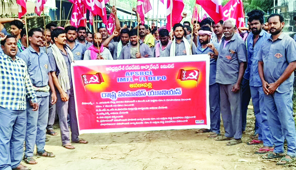 కూలి రేట్లు పెంచాలని కోరుతూ మండలంలోని శంకరం గ్రామం వద్ద ఉన్న జిల్లా ఎక్సైజ్ బేవరేజెస్ డిపోలో పనిచేస్తున్న శుక్రవారం డిపో ముందు ధర్నా చేపట్టారు. ఈ సందర్భంగా ఎగుమతులను నిలుపుదల చేశారు. ఈ సందర్భంగా డిపో హమాలీల యూనియన్ (సిఐటియు) అధ్యక్ష కార్యదర్శులు జీరు కనక రమణ, కరణం కొండలరావు మాట్లాడుతూ పెరిగిన నిత్యవసర వస్తువుల ధరలకు అనుగుణంగా మద్యం పెట్టే ఒక్కంటికి ప్రస్తుతం ఇస్తున్న రేటుకు రూ.3 కలిపి రూ.10 చెల్లించాలని డిమాండ్ చేశారు. అంతవరకు ఎగుమతులను నిలుపుదల చేస్తూ సమ్మె చేపడతామని హెచ్చరించారు. హమాలీలకు ప్రభుత్వ గుర్తింపు కార్డులు ఇవ్వాలని, పిఎఫ్, ఈఎస్ఐ, పెన్షన్ అమలు చేయాలని కోరారు. ఒప్పందం ముగిసినా పెరుగుతున్న ధరలకు అనుగుణంగా కూలి రేట్లు పెరగకపోవడంతో కార్మికులు ఆర్థిక ఇబ్బందులు పడుతున్నారని ఆవేదన వ్యక్తం చేశారు. పెంచిన ధరలు ఈ ఏడాది నవంబర్ 1 నుంచి అమలు జరిగేలా చర్యలు తీసుకోవాలని కోరారు. ఈ కార్యక్రమంలో కార్మికులు టి.రాజు, బి శ్రీను, బి సూర్య నాయుడు, సిహెచ్ రాజేష్, ఎస్ ప్రసాద్ తదితరులు పాల్గొన్నారు.