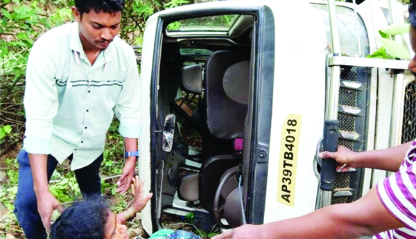అల్లూరి సీతారామరాజు జిల్లా, చింతూరు మండలం, మోతుగూడెం పోలీస్ స్టేషన్ పరిధి మారేడుమిల్లి ఘాట్ రోడ్లో ఆదివారం తెల్లవారుజామున టాటా మ్యాజిక్ వాహనం బోల్తా పడింది. బాధితులు, పోలీసుల కథనం ప్రకారం... అనకాపల్లి జిల్లా మార్టూరు కోడూరు, లింగాపురం గ్రామాలకు చెందిన మల్లేష్, ఇ.వరాలమ్మ, జి.లీల, ఎ.కుమారి, ఆర్.లక్ష్మి, ఎ.మాధవరావు, బి.రఘు, ఎ.మనోజ్ కుమార్, ఆర్.హారిక, ఇ.భార్గవ్, ఎ.లక్ష్మీ ప్రసాద్ తదితర 11 మంది టాటా మ్యాజిక్ వాహనంలో భద్రాచలం సీతారాముల దర్శనానికి బయలుదేరారు. ఆదివారం తెల్లవారుజామున 5 గంటల సమయంలో మారేడుమిల్లి ఘాట్ రోడ్డులో కనకదుర్గ గుడి సమీపంలోని మలుపు వద్ద వాహనం అదుపుతప్పి 200 అడుగుల లోయలోకి బోల్తా పడింది. దీంతో వాహనంలో ప్రయాణిస్తున్న ఇ.వరాలమ్మ, జి.లీల, ఎ.కుమారి, ఆర్.లక్ష్మి, ఎ.మాధవరావు, బి.రఘు, ఎ.మనోజ్ కుమార్, ఆర్.హారిక, ఇ.భార్గవ్, ఎ.లక్ష్మీ ప్రసాద్తో పాటు డ్రైవర్ వినోద్ ప్రమాదంలో గాయపడ్డారు. 108 సిబ్బందికి సమాచారం ఇవ్వడంతో హుటాహుటిన 108 వాహనం వచ్చి క్షతగాత్రులను చింతూరు ఏరియా ఆసుపత్రికి తరలించారు. ఈ ప్రమాదంలో ఎవరికీ ఎటువంటి ప్రాణహాని జరగలేదు. 12 మంది చిన్నచిన్న గాయాలతో బయటపడడంతో అందరూ ఊపిరి పీల్చుకున్నారు. మోతుగూడెం పోలీస్లు కేసు నమోదు చేసి దర్యాప్తు చేస్తున్నారు.