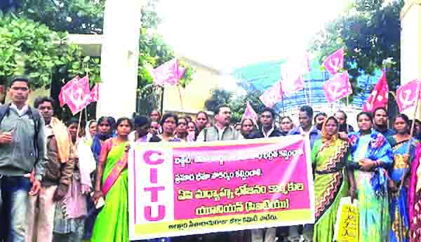 ప్రజాశక్తి-పాడేరు: పాఠశాలల్లో మధ్యాహ్న భోజనం కార్మికుల సమస్యలు పరిష్కరించకుండా తక్కువ వేతనాలతో ప్రభుత్వం వెట్టి చాకిరి చేయిస్తుందని సిఐటియు అల్లూరి జిల్లా అధ్యక్షులు బోనంగి చిన్నయ్య పడాల్ దుయ్యబట్టారు. సిఐటియు రాష్ట్ర కమిటీ పిలుపు మేరకు మధ్యాహ్న భోజన కార్మికులు సోమవారం ఐటీడీఏ నుంచి కలెక్టరేట్ ఆఫీస్ వరకు ర్యాలీ నిర్వహించి కలెక్టరేట్ వద్ద ధర్నా చేపట్టారు. ఈ ధర్నానుద్దేశించి చిన్నయ్య పడాల్ మాట్లాడుతూ, మధ్యాహ్న భోజన కార్మికులు అతి తక్కువ జీతాలతో పని చేస్తున్నారని, బడిలో పిల్లలకు మధ్యాహ్న భోజనం వండి పెట్టడానికి పెట్టుబడులు లేక, చేసిన అప్పులు కట్టలేక తీవ్రమైన ఇబ్బందులు పడుతున్నారని ఆవేదన వ్యక్తం చేశారు. ఒకపక్క ధరలు ఆకాశాన్ని అంటుతున్నా కార్మికులకు ఇచ్చే జీతం రెండు వేలతో నెల అంతా ఎలా బతకాలని ప్రభుత్వాన్ని ప్రశ్నించారు. పనికి తగిన వేతనాలు అందక మధ్యాహ్న భోజన కార్మికులు తీవ్ర ఇబ్బందులు ఎదుర్కొంటున్నారని అన్నారు. ఈ కార్మికులకు ఉద్యోగ భద్రత కల్పించి, కనీస వేతనాలు నెలకు 26,000 ఇవ్వాలని డిమాండ్ చేశారు. పాఠశాలల్లో బడి పిల్లలకు భోజనం వండి పెట్టేందుకు ప్రభుత్వమే గ్యాస్ సరఫరా చేసి, ఒక పిల్లవాడికి భోజన నిమిత్తం రోజు కు ఇచ్చే 6 రూపాయల 85 పైసల సొమ్ము చాలలేదని, రోజుకు 20 రూపాయలు చొప్పున పెంచాలని డిమాండ్ చేశారు. సకాలంలో బియ్యం సరఫరా చేయకపోవడంతో మధ్యాహ్న భోజన కార్మికులు తమ ఇంట్లో బియ్యం తీసుకొచ్చి పిల్లలకు వండి పెడుతున్నారని తెలిపారు.