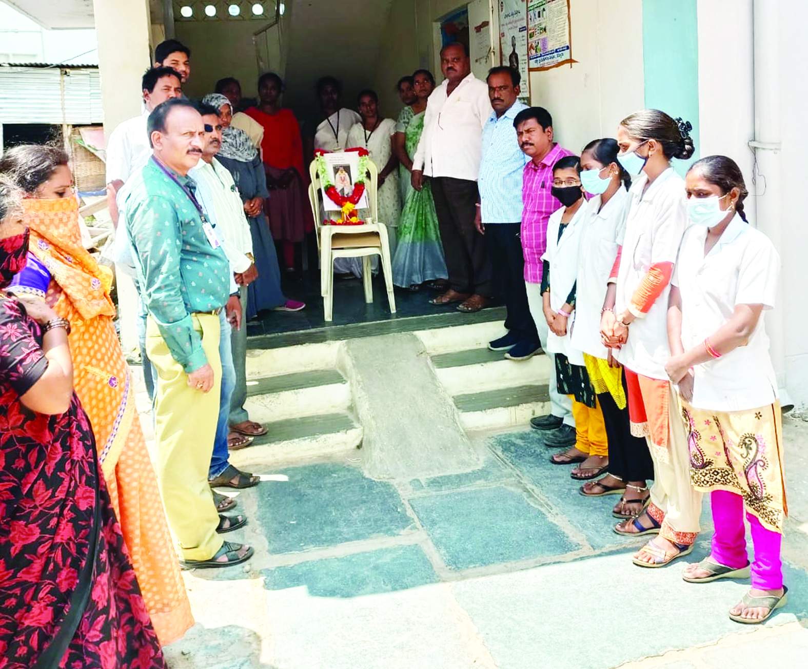 మృతుని చిత్రపటానికి పూలమాల వేసి నివాళులర్పిస్తున్న వైద్య ఉద్యోగులు
