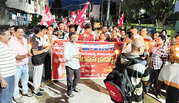ప్రజాశక్తి- శ్రీకాకుళం: మణిపూర్లో మహిళలను నగంగా తిప్పడం సభ్య సమాజానికి అవమానకరమని యుటిఎఫ్ రాష్ట్ర కార్యదర్శి చౌదరి రవీంద్ర, జిల్లా అధ్యక్ష, ప్రధాన కార్యదర్శులు పి.అప్పారావు, ఎస్.కిరషోర్కుమార్ అన్నారు. మణిపూర్లో మహిళలపై దారుణ ఘటనలు, మారణకాండను నిరసిస్తూ నగరంలోని డైమండ్ పార్కు నుంచి ఏడు రోడ్ల కూడలి వరకూ గురువారం కొవ్వొత్తులతో నిరసన ప్రదర్శన చేపట్టారు. ఈ సందర్భంగా వారు మాట్లాడుతూ 'ఇది రెండు జాతుల మధ్య చిచ్చుపెట్టి అక్కడ రాష్ట్ర, కేంద్ర ప్రభుత్వాలు తమకేమి తెలియదన్నట్లు నిమ్మకునీరేత్తినట్లు మౌనంగా ఉన్నారని అన్నారు. ఇదంతా కేంద్ర ప్రభుత్వ కుట్రలో భాగమేనని అన్నారు. ఇది కేంద్ర ప్రభుత్వ నిరంకుశత్వానికి తార్కాణమన్నారు, ఉద్దేశపూర్వంగ ప్రజలను రెచ్చగొట్టి అమానవీయ చర్యలకు పాల్పడుతుందన్నారు. ఈ ఆటవిక వికృత చేష్టలను ఆపాలని, లేకుంటే స్త్రీ మూర్తుల కన్నీటి కడలిలో కొట్టుకపోక తప్పదని హెచ్చరించారు. ఈ కార్యక్రమానికి సంఘీ భావంగా జిల్లా సిఐటియు ప్రధాన కార్యదర్శి పి.తేజస్వి, పోస్టల్ అసోసియేషన్ నాయకులు గణపతిరావు, యుటిఎఫ్ జిల్లా నాయకులు హెచ్.అన్నాజీరావు, పి.సూర్యప్రకాశరావు, జి.సురేష్కుమార్, బి.రవికుమార్, రాష్ట్ర కార్యవర్గ సభ్యులు వై.ఉమాశంకర్ పాల్గొన్నారు.