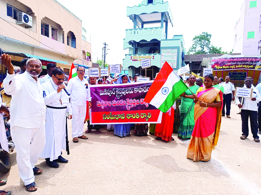 దుగ్గిరాల: మణిపూర్లో ఘటనలను నిరిసిస్తూ మండల కేంద్రం దుగ్గిరాలలో సోమవారం శాంతి ర్యాలీని నిర్వహించారు. ముం దుగా దళితవాడలోని లూధరన్ చర్చి వద్ద శాంతికి చిహ్నంగా పావురాలను ఎగురవేశారు. అనంతరం ర్యాలీ నిర్వహించారు. జడ్పిటిసి మేకతోటి అరుణ జాతీయ జెండా ఊపి ర్యాలీని ప్రారం భించారు. అనంతరం తహశీల్దార్ కె.మల్లేశ్వరికి అర్జీని అంద జేశారు. ఈ సందర్భంగా దుగ్గిరాల మండలం పాస్టర్ ఫెలోషిప్ అధ్యక్షుడు ఉన్నం సురేష్బాబు మాట్లాడుతూ మణిపూర్లో ఘోరమైన సంఘటనలు జరుగుతున్నప్పటికీ కేంద్రం, అక్కడి రాష్ట్ర ప్రభుత్వం స్పందిం చడం లేదని, ఇలాంటి ఘటనలు పునరావృతం కాకుండా చర్యలు తీసుకోవాలని డిమాండ్ చేశారు. చేబ్రోలు: మణిపూర్ ఘటనలను చేబ్రోలు క్రైస్తవ సమాఖ్య, పాస్టర్స్ ఫెలోషిప్పులు, క్రైస్తవ సంఘాలు నిరసించాయి. తహశీల్దార్ , మండల మేజిస్ట్రేట్, కె వి గోపాలకృష్ణ, చేబ్రోలు స్టేషన్ హౌస్ ఆఫీసర్ కె.ఆనంద్, మండల పరిషత్ అభివృద్ధి అధికారి బి.బాబు రావుకు వినతిపత్రం అందజేశాయి.