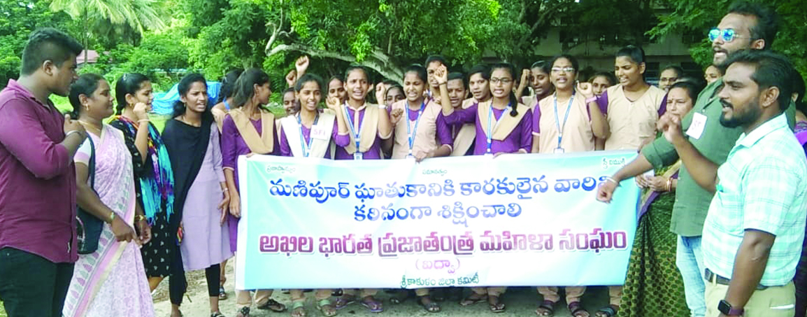 ప్రజాశక్తి - శ్రీకాకుళం ప్రతినిధి : మణిపూర్లో మహిళలకు రక్షణ కరువైందని ఐద్వా జిల్లా కన్వీనర్ అల్లాడ లక్ష్మి, ఎస్ఎఫ్ఐ జిల్లా అధ్యక్షులు సిహెచ్.రాజు అన్నారు. మణిపూర్లో ఘటనలకు బాధ్యులను శిక్షించాలని, శాంతిని నెలకొల్పాలని శ్రీకాకుళం నగరంలోని ప్రభుత్వ మహిళా డిగ్రీ కళాశాల వద్ద ఐద్వా, ఎస్ఎఫ్ఐ ఆధ్వర్యాన మంగళవారం ధర్నా నిర్వహించారు. ఈ సందర్భంగా వారు మాట్లాడుతూ మణిపూర్లో మహిళలపై జరుగుతున్న దాడులు అత్యంత హేయమైనవన్నారు. మూడు నెలలుగా అక్కడ ఘర్షణలు జరగుతున్నా, వాటిని నియంత్రించడంలో కేంద్ర, రాష్ట్ర ప్రభుత్వాలు విఫలమయ్యాయన్నారు. మణిపూర్లో ఆదివాసీ మహిళపై దాడి జరిగిన మరుసటి రోజే డేరాబాబా, బ్రిజ్భూషణ్ సింగ్కు బెయిల్ ఇచ్చి ఊరట కల్పించడాన్ని తీవ్రంగా ఖండించారు. నిత్యం దేశభక్తి జపం చేస్తున్న బిజెపి ప్రభుత్వం, మహిళలపై జరుగుతున్న దాడులపై మాట్లాడడం లేదని విమర్శించారు. ప్రపంచ దేశాలు మణిపూర్ ఘటనపై దిగ్భ్రాంతిని వ్యక్తం చేస్తున్నా, బిజెపి మహిళా ఎంపీలు ఎందుకు మౌనంగా ఉన్నారని ప్రశ్నించారు. ప్రభుత్వాలు ఇప్పటికైనా స్పందించి ఇలాంటి ఘటనలు పునరావృతం కాకుండా చర్యలు తీసుకోవాలని డిమాండ్ చేశారు. కార్యక్రమంలో ఐద్వా నగర కన్వీనర్ శ్రీదేవి పాణిగ్రహి, ఎస్ఎఫ్ఐ జిల్లా కార్యదర్శి బి.హరీష్, నాయకులు ఎం.లలిత, స్వర్ణ, స్వాతి, పావని, కళాశాల విద్యార్థినులు పాల్గొన్నారు.