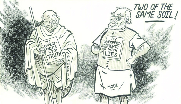 దేశ చరిత్ర తోనూ, చారిత్రిక వాస్తవాలతోనూ చెలగాటమాడే ఈ తరహా ఉదాహరణలు ఆర్.ఎస్.ఎస్, బిజెపిల చరిత్రలో కోకొల్లలు. వాస్తవం ఏమంటే చరిత్ర అంటే జరిగిపోయిందే గాని చరిత్ర కథనం వర్తమానంలో జరుగుతుంది. గతం నుంచి వర్తమానానికి రావడమే కాదు, వర్తమానం నుంచి గతాన్ని చూపడమూ చూడడమూ చరిత్రలోనే జరుగుతుంది. చరిత్ర విజేతల ఖడ్గంతో రాయబడుతుందంటారందుకే. గతాన్ని నేటి అవసరాలకు అనుగుణంగా వక్రీకరించి చూపడం పాలకులకు ఎప్పుడూ అలవాటే. వ్యతిరేక అనుకూల ప్రచారాలు అలానే నడుస్తాయి. కమ్యూనిస్టులపై నిరంతరం అనేక అసత్య ప్రచారాలు చేసే పాలకులు వారు సాధించిన సానుకూల విజయాలు సాగించిన విప్లవాల గురించి పొరబాటున కూడా ప్రస్తావించరు. కాంగ్రెస్ హయాంలోనూ గాంధీ కుటుంబం ఆమోదించిన నాయకులనే ఎక్కువ చేసిన మాట అసత్యం కాదు. ఎప్పుడైనాసరే కొందరు నాయకుల చుట్టూ పరిభ్రమణం కంటే విశాల జనరాశుల పాత్ర గుర్తించడం ముఖ్యం. అయితే తమకు సంబంధమే లేని స్వాతంత్య్ర పోరాటంతో సంధానం చేసుకోవడం, కొంతమందిని కాంగ్రెస్ నుంచి విడదీసి వకాల్తా పుచ్చుకున్నట్టు మాట్లాడ్డం మోడీ పాలనలో వ్యూహం. ఈ క్రమంలో వారి బోధనలూ ఆశయాలు తారుమారవుతుంటాయి. గాంధీజీ మత సామరస్య సందేశం వెనక్కు కొట్టడం అలాంటిదే. సరిగ్గా ఆ కారణం చేతనే మనం దాన్ని మరింత గట్టిగా నొక్కి చెప్పవలసి వస్తుంది. వర్తమానంలో చేసే పోరాటాలతో పాటు చారిత్రక వారసత్వం కూడా సవ్యంగా కాపాడుకోవలసి వుంటుంది. గాంధీజీని ఆర్.ఎస్.ఎస్ తరహాలో మలుచుకునే ఈ అతితెలివి వ్యూహాలను అప్రమత్తంగా గమనిస్తూనే ఆయన నిజమైన వారసత్వాన్ని కాపాడుకోవలసిన బాధ్యత ప్రజాస్వామిక వాదులపై వుంటుంది.