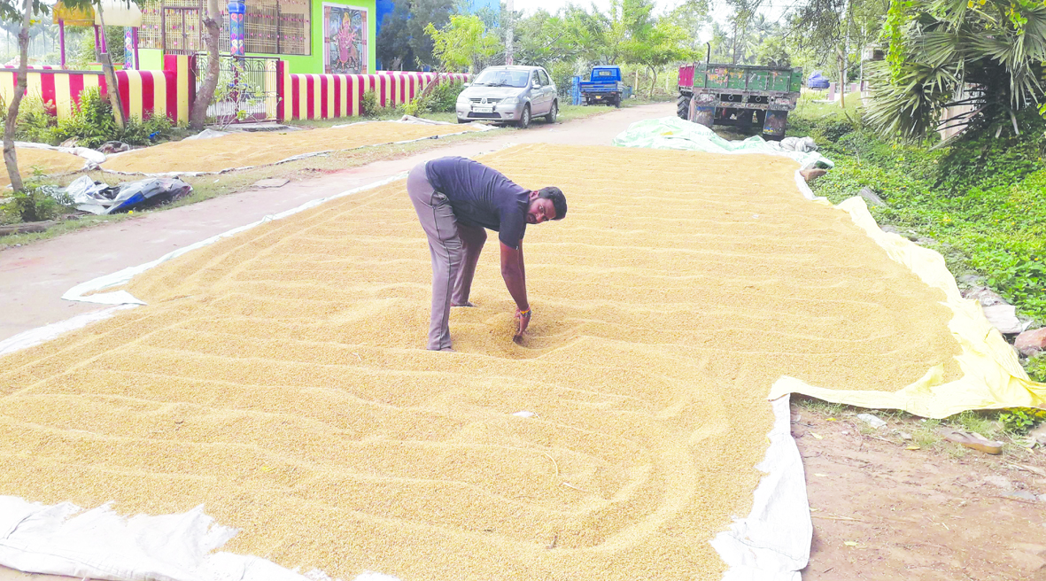 రైతులను వాన కష్టాలు వదలడంలేదు. తుపాన్ ప్రభావంతో కురిసిన వర్షాలకు మండలంలో ఇప్పటికే రైతులు తీవ్రంగా నష్టపోయారు. వర్షాలు కాస్త తెరిపి ఇవ్వడంతో మిగిలిన పంటను కాపాడుకునే ప్రయత్నాల్లో రైతులు ఉన్నారు. ఈ దశలో శనివారం రాత్రి ఆకస్మాత్తుగా మండలంలోని పలు గ్రామాల్లో భారీగా వర్షం కురిసింది. దీంతో కోసిన పనలపై ఉన్న వరి పైరు తడిసిపోయింది. కల్లాల్లోకి వర్షపు నీరు వచ్చి చేరడంతో ధాన్యాపు రాసులు తడిశాయి. దీంతో ఆదివారం ఉదయన్నే ఉరుకులు, పరుగులు మీద రైతులు కల్లాలో నిలిచిన వర్షపు నీటిని బయటకు మళ్లించే పన్నుల్లో నిమఘ్నమయారు. తుపాన్ గండం గడచింది దేవుడా అనుకునే లోపు మళ్లీ భారీ వర్షం కురవడంతో రైతులు ఆందోళన చెందుతున్నారు. కల్లాల్లో ఆరబెట్టిన ధాన్యం వర్షపు నీటికి తడిసిపోయింది. పంటలు చేతికి వచ్చే సమయంలో అకాల వర్షాలు తుపాన్ కారణంగా అన్నదాతలు ఊసూరుమంటున్నారు. మండలంలో ముమ్మరంగా వ్యవసాయ పనులు జరుగుతున్న తరుణంలో మళ్లీ కురిసిన వర్షం రైతులను కోలుకొని దెబ్బతీసిందని రైతులు అంటున్నారు. మండలవ్యాపంగా ఏడు వందల ఎకరాల్లో కోసిన వరిపైరు పనలపై ఉంది. దీనికి తోడు తేమ శాతం ఎక్కువగా ఉందనే సాకుతో అటు రైతులను మిల్లర్లు, అటు ఆర్బికె అధికారులు ముప్పతిప్పలు పెడుతున్నారు. ఒకపక్క వర్షం, మరోపక్క ధాన్యం కొనేందుకు అధికారులు పెట్టే నిబంధనలతో రైతులు లబోదిబోమంటున్నారు. వాతావరణంలో మార్పులు, శీతాకాలం కావడంతో ధాన్యం ఆరేందుకు వారాలు సమయం పడుతుంది. ఈ లోగా మళ్లీ వర్షం పడడంతో రైతులు పరిస్థితి ఆగమ్యగోచరంగా మారింది. ఇప్పటికైనా ప్రభుత్వం స్పందించి నిబంధనలు సడలించి తడి, పొడి ధాన్యాన్ని కొనుగోలు చేసి రైతులను ఆదుకోవాలని మండలంలోని రైతాంగం ప్రభుత్వాన్ని కోరుతోంది.