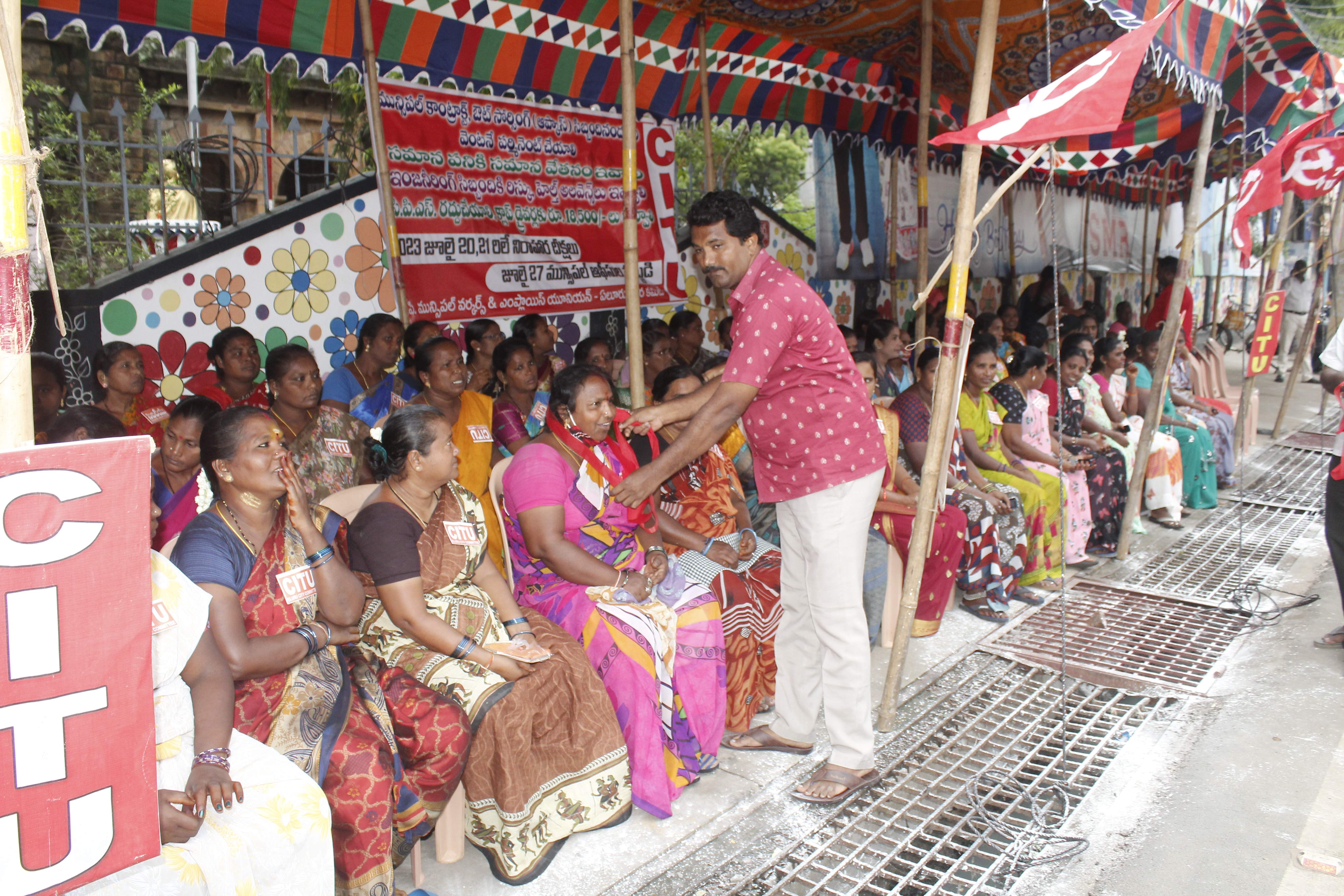 మున్సిపల్ ఆప్కాస్ సిబ్బందిని పర్మినెంట్ చేయాలని, సమాన పనికి సమాన వేతనం ఇవ్వాలని కోరుతూ మున్సిపల్ కాంట్రాక్ట్ మహిళా కార్మికులు(ఆప్కాస్) నగరపాలక సంస్థ కార్యాలయం వద్ద గురువారం రిలే నిరాహార దీక్ష చేపట్టారు. ఈ శిబిరాన్ని సిఐటియు జిల్లా ప్రధాన కార్యదర్శి డిఎన్విడి.ప్రసాద్ దీక్షాదారులకు మెడలో ఎర్రరిబ్బన్లు వేసి ప్రారంభించారు. ఈ సందర్భంగా ఆయన మాట్లాడుతూ సిఎం జగన్ 2019 ఎన్నికలకు ముందు మున్సిపల్ కార్మికులకు ఇచ్చిన హామీలను అమలు చేయడం లేదని విమర్శించారు. కాంట్రాక్టు, అవుట్ సోర్సింగ్ సిబ్బందిని పర్మినెంట్ చేయాలని డిమాండ్ చేశారు. లేని పక్షంలో మున్సిపల్ కార్మికుల ఆందోళన మరింత ఉధృతం చేస్తామని హెచ్చరించారు. అనంతరం యూనియన్ జిల్లా గౌరవ అధ్యక్షులు, సిఐటియు జిల్లా ఉపాధ్యక్షులు బి.సోమయ్య మాట్లాడారు. శిబిరాన్ని సిఐటియు నగర అధ్యక్షులు బి.జగన్నాధరావు, ఆటో వర్కర్స్ యూనియన్ నాయకులు బి.నాగసూరిబాబు, జె.గోపి, అంగన్వాడీ వర్కర్స్ హెల్పర్ యూనియన్ నాయకురాలు కె.విజయలక్ష్మి, స్కూల్ స్వీపర్ల యూనియన్ నాయకురాలు జె.స్వాతి, నవ సమాజ పార్టీ అధ్యక్షులు ఎం.మహంకాళీ, జ్యూట్ వర్కర్స్ యూనియన్ల నాయకులు జి.కోటేశ్వరరావు సందర్శించి మద్దతు తెలిపారు. ఈ కార్యక్రమానికి మున్సిపల్ వర్కర్స్ యూనియన్ జిల్లా ప్రధాన కార్యదర్శి ఎ.జాన్బాబు అధ్యక్షత వహించారు. ఈ దీక్షలో మహిళా కార్మికులు వందలాది మంది పాల్గొన్నారు. మేతర పాప, మరియమ్మ, బండి భవాని, వెంకటలక్ష్మి, కోన మధుమతి, నక్కా భాగ్యలక్ష్మి, తేగల సత్యవతి, ఒ.కాంతమ్మ, వి.దుర్గ, బి.దుర్గ, అర్జి రాజమ్మ, రంగమ్మ, కత్తి విజయకుమారి, నరమామిడి నాగమణి, కోటమ్మ, జీవనమ్మ, తదితరులు ఆందోళనకారులకు సంఘీభావం తెలిపారు.