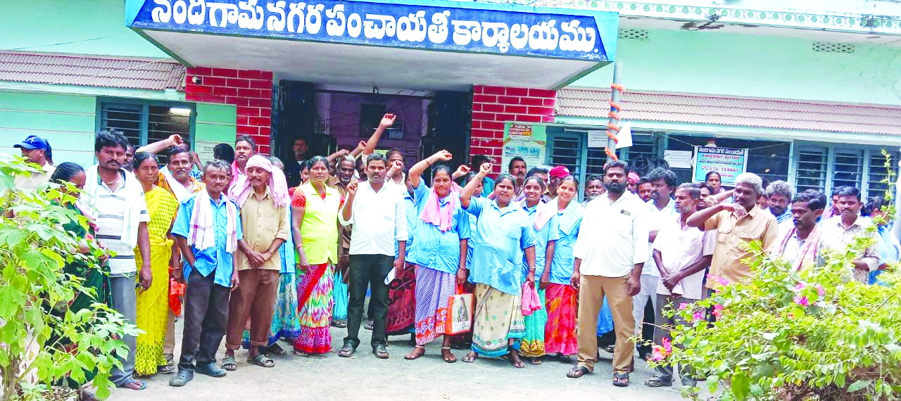 ప్రజాశక్తి-ఇబ్రహీంపట్నం: ఎపి మున్సిపల్ వర్కర్స్ ఎంప్లాయిస్ యూనియన్ (సిఐటియు) రాష్ట్ర కమిటీ పిలుపు మేరకు కొండపల్లి కమిటీ ఆధ్వర్యంలో కొండపల్లి మున్సిపల్ కార్యాలయం వద్ద ధర్నా నిర్వహించారు. ఈ సందర్భంగా సిఐటియు మండల కార్యదర్శి మహేష్ మాట్లాడుతూ మున్సిపల్ కార్మికుల్ని రాష్ట్ర ప్రభుత్వం వెంటనే పర్మినెంట్ చేయాలని లేని పక్షంలో రాష్ట్ర వ్యాప్తంగా ఉద్యమం తీవ్రతరం చేస్తామని హెచ్చరించారు. మున్సిపల్ కార్మికులకు రెండు జతల బట్టలు, కొబ్బరి నూనె, సబ్బులు, చెప్పులు, లైఫ్ జాకెట్స్ ఇవ్వాలన్నారు. పెండింగ్లో ఉన్న రెండు నెలల జీతాలు, ఏరియర్స్ విడుదల చేయాలని డిమాండ్ చేశారు. ఈ కార్యక్రమంలో సిఐటియు నాయకులు దేవుళ్లు అప్పారావు, సూరిబాబు, రమణ, సింహాచలం, నాగేశ్వరరావు, మణికంఠ, అప్పల నరసమ్మ, మాణిక్యం, సూరి, లక్ష్మి, రమణమ్మ,నాగేశ్వరమ్మ తదితరులు పాల్గొన్నారు. ప్రజాశక్తి-నందిగామ: సమస్యలు పరిష్కరించాలని డిమాండ్ చేస్తూ నందిగామ మున్సిపల్ కార్యాలయం వద్ద కార్మికులు శుక్రవారం ధర్నా చేశారు. మున్సిపల్ అధికారి ప్రసాద్కి అర్జీ అందజేశారు. ఈ సందర్భంగా సిఐటియు నందిగామ మండల కార్యదర్శి కె.గోపాల్ మాట్లాడుతూ మున్సిపల్ కార్మికులకు సమాన పనికి సమాన వేతనం ఇవ్వాలని డిమాండ్ చేశారు. ఇంజనీరింగ్ కార్మికులకు హెల్త్ కార్డులు, రిస్క్ అలవెన్స్ తదితర సమస్యలు పరిష్కరించాలని కోరారు. ఈ కార్యక్రమంలో నాయకులు సలికేటి నరేష్, పుట్ట మాణిక్యం, మాడుగుల నాగరాజు, ఖమ్మంపాటి రూతమ్మ, బేబీ, పిచ్చయ్య, నతానేలు, పుల్లయ్య తదితరులు పాల్గొన్నారు.