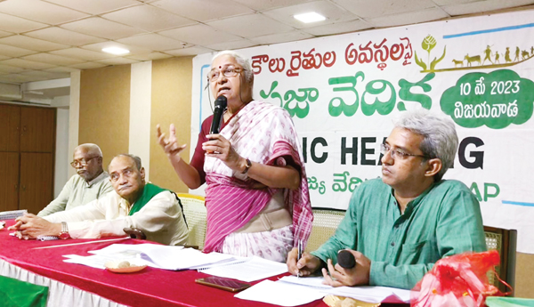 ప్రజాశక్తి - అమరావతి బ్యూరో : కౌలురైతులు తమ హక్కులను సాధించుకునే వరకు అహింసా పద్ధతుల్లో సత్యాగ్రహ పోరాటాల ద్వారా ఉద్యమించాలని ప్రజా ఉద్యమాల జాతీయ వేదిక నాయకులు, సంయుక్త కిసాన్మోర్చా రైతు ఉద్యమ నాయకులు మేథాపాట్కర్ తెలిపారు. పంట సాగు చేస్తున్నట్లు రైతు సెల్ఫ్ డిక్లరేషన్ ఇచ్చిన అనంతరం గ్రామ పంచాయతీ పరిధిలోనే సర్టిఫికెట్ ఇస్తే సరిపోతుందన్నారు. అంతేకానీ భూ యజమాని సంతకంతో లింక్ పెట్టాల్సిన అవసరం లేదన్నారు. విజయవాడ ఎంబివికెలో కౌలు రైతుల సమస్యల పరిష్కారానికి రైతు స్వరాజ్యవేదిక ఆధ్వర్యాన పబ్లిక్ హియరింగ్ కార్యక్రమంలో ముఖ్య అతిథిగా మేథాపాట్కర్ హాజరయ్యారు. ఈ సందర్భంగా ఆమె మాట్లాడుతూ.. రైతు భరోసా పేరుతో కేంద్ర, రాష్ట్ర ప్రభుత్వాలు డబ్బులిస్తున్నాయని, రైతులకు కావాల్సింది పండించిన పంటకు గిట్టుబాటు ధర మాత్రమేనన్నారు. కౌలు రేట్లు బాగా పెరిగిపోయాయని, రేట్లలో ఏదో ఒకరకమైన నియంత్రణ తీసుకురావాలని ఆమె అభిప్రాయపడ్డారు. ప్రకృతి వల్ల నష్టపోయిన సమయాల్లో నష్టపరిహారం కౌలు రైతులకు అందాలన్నారు. కార్పొరేట్లకు ఏదైనా చేసేందకు ప్రభుత్వం సిద్ధంగా ఉందని, కౌలు రైతులకు సహాయం చేసేందుకు ప్రభుత్వాలు సిద్ధంగా లేవని ఆమె విమర్శించారు. దేశ నిర్మాతలు రైతులేనన్నారు. రైతులవి ఆత్మహత్యలు కావని, అవన్నీ వ్యవస్థ చేసే హత్యలుగా పరిగణించాలని పేర్కొన్నారు. దేశ వ్యాప్తంగా వీటిపై రుణవిముక్తి చట్టాన్ని, కనీస మద్దతు ధరల చట్టాన్ని ప్రభుత్వం అమలు చేయాలన్నారు. విజరుమాల్యా, నీరవ్మోడీ వంటి వారు బ్యాంకులకు రూ.కోట్లు ఎగ్గొట్టి విదేశాలకు పారిపోతున్నారని, కష్టం చేసుకుని ఇక్కడ ప్రకృతి నేల మీద ఆధారపడుతున్న వారిని ప్రభుత్వాలు పట్టించుకోవడం లేదని ఆమె విమర్శించారు. 2013లో భూ సేకరణ చట్టం తీసుకువచ్చినా రాష్ట్ర ప్రభుత్వం అమరావతి కోసం ల్యాండ్ పూలింగ్లో భూములు తీసుకుందన్నారు. దేశ వ్యాప్తంగా అటవీ భూములు సైతం కార్పొరేట్ శక్తుల చేతుల్లోకి వెళుతున్నాయన్నారు. రాష్ట్రంలో 30 లక్షల మంది కౌలు రైతులున్నారని, పంట సాగుదారుహక్కుల చట్టాన్ని సిఎం వైఎస్ జగన్ అమలు చేయలన్నారు. త్వరలో కౌలు రైతుల సమస్యల పరిష్కారం కోసం సిఎంను కలుస్తామని ఆమె తెలిపారు.