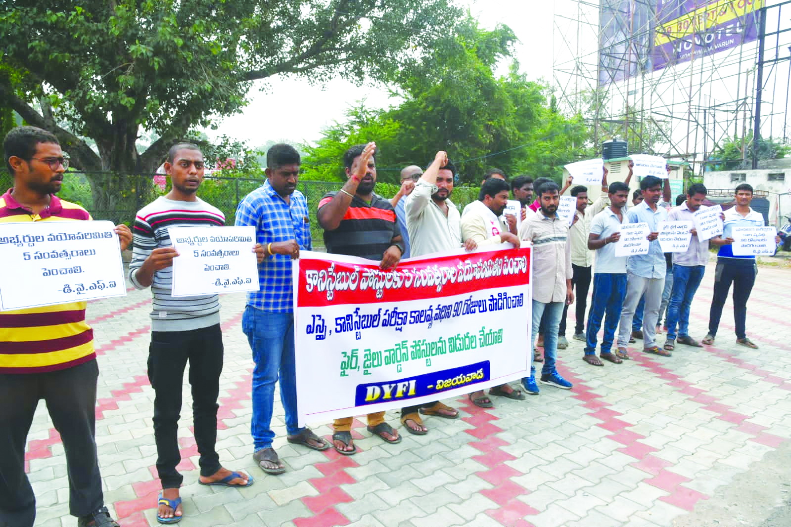ప్రజాశక్తి-విజయవాడ: రాష్ట్ర ప్రభుత్వం అనాలోచిత నిర్ణయాల వల్ల నిరుద్యోగులు పలు రూపాల్లో నష్టపోతున్నారని, ఇప్పటికైనా ప్రభుత్వం గుర్తించి న్యాయం చేయకపోతే రాష్ట్రవ్యాప్తంగా ఉద్యమిస్తామని డివైఎఫ్ఐ రాష్ట్ర కార్యదర్శి జి.రామన్న హెచ్చరించారు. పోలీసు కానిస్టేబుల్, ఎస్ఐ పోస్టుల అభ్యర్ధుల వయస్సు ఐదు సంవత్సరాలు పెంచడంతో పాటు ప్రాధమిక పరీక్ష కాల వ్యవధి 90 రోజులకు పెంచాలని కోరుతూ స్థానిక ధర్నా చౌక్లో సోమవారం డివైఎఫ్ఐ ఆధ్వర్యంలో ధర్నా నిర్వహించారు. రామన్న మాట్లాడుతూ నిరుద్యోగులను కేంద్ర, రాష్ట్రప్రభుత్వాలు దగా చేస్తున్నాయని ధ్వజమెత్తారు. వివిధ ప్రభుత్వ శాఖల్లోని ఖాళీ పోస్టులను ఏళ్ల తరబడి భర్తీ చేయకపోవడంతో, ఉన్నత చదువులు చదువుకున్న యువతీ యువకులు నిరుద్యోగులుగా మిగిలిపోవాల్సి వస్తోందన్నారు. 2018 తరువాత 6,511 పోలీసు పోస్టుల భర్తీకి ప్రభుత్వం ముందుకొచ్చిందన్నారు. వైసిపి అధికారంలోకి వచ్చిన ఈ మూడున్నరేళ్ల తర్వాత 25 వేల ఖాళీ పోస్టులు ఒక్క పోలీసు శాఖలోనే ఉన్నాయన్నారు. జాబ్లు లేని జాబ్ క్యాలెండర్ విడుదల చేసి నిరుద్యోగులను మోసం చేసిన వైసిపి ప్రభుత్వం, ఇప్పుడు మరోమారు నిరుద్యోగుల ఆశలపై నీళ్లు చల్లిందని విమర్శించారు. కనీసం 15వేల పోస్టులైనా విడుదల చేస్తారని ఆశపడ్డ నిరుద్యోగులకు చివరకు నిరాశే మిగిలిందన్నారు. దీనికి తోడు గత ఐదేళ్లుగా ఉద్యోగాల భర్తీకి నోటిఫికేషన్ విడుదల చేయకపోవడంతో అభ్యర్థుల వయో పరిమితి దాటిపోయిందన్నారు. నోటిఫికేషన్లో కానిస్టేబుల్కు 24, ఎస్సై 27 సంవత్సరాల వయోపరిమితి ఇచ్చారని, దీని వల్ల ఇన్ని రోజుల పాటు సన్నద్దమైన మూడు లక్షల మంది అభ్యర్థులు అర్హత కోల్పోయారని మండిపడ్డారు. ప్రభుత్వం చేసిన తప్పిదం వలన నిరుద్యోగులు బలి కావాల్సి వస్తోందని విమర్శించారు. ఫైర్, జైల్ వార్డెన్ పోస్టులు భర్తీ చేయాలని కోరారు. ఈ కార్యక్రమంలో డివైఎఫ్ఐ ఎన్టిఆర్ జిల్లా అధ్యక్షులు పుప్పాల కష్ణ, సెంట్రల్ సిటీ కార్యదర్శి షేక్ నిజాముద్దీన్, నగర నాయకులు శివ, నోహిత్ కష్ణ, రాము తదితరులు పాల్గొన్నారు. ప్రజాశక్తి-తిరువూరు: తిరువూరు బోసుబొమ్మ సెంటర్లో సోమవారం ధర్నా చేసి ఆర్డీవో ప్రసన్నలక్ష్మికి వినతిపత్రం అందజేశారు. ఈ సందర్భంగా డివైఎఫ్ఐ ఎన్టీఆర్ జిల్లా కార్యదర్శి ఎన్.నాగేశ్వరరావు మాట్లాడుతూ వయో పరిమితి, పరీక్ష కాలవ్యవధి తక్కువగా ఉండడంతో ఎస్సై, కానిస్టేబుల్ పోస్టులకు ప్రిపేర్ అయ్యే అభ్యర్థులు ఆందోళన చెందుతున్నారన్నారు. ఈ కార్యక్రమంలో డివైఎఫ్ఐ జిల్లా సహాయ కార్యదర్శి సిహెచ్.సత్య నారాయణ తదితరులు పాల్గొన్నారు. ప్రజాశక్తి-నందిగామ: నందిగామ ఆర్డీవో రవీంద్రరావుకు ఎస్ఎఫ్ఐ, డివైఎఫ్ఐ నాయకులు వినతిపత్రం అందజేశారు. ఈ కార్యక్రమంలో డివైఎఫ్