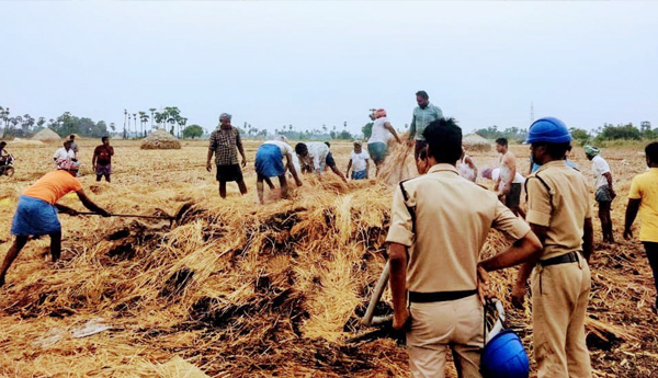 ప్రజాశక్తి-భట్టిప్రోలు : భట్టిప్రోలు మండలం సురేపల్లి పంచాయతీ పరిధిలోని తాతావారి పాలెం గ్రామంలో గుర్తు తెలియని వ్యక్తులు వరి కుప్పలకు నిప్పంటించారు. గ్రామానికి చెందిన పడమట శివరామకృష్ణకు చెందిన 1.50 ఎకరాల వరి కుప్ప దగ్ధం అయ్యింది. గత రెండు నెలల కాలంలో నాలుగు వరి కుప్పలు, రెండు వరి గడ్డి వాములు అగ్గిపాలయ్యాయి. దీనికి కారకులైన వారిని పట్టుకుని శిక్షించాలని గ్రామస్థులు కోరుతున్నారు. కాగా గురువారం జరిగిన ఘటనలో అగ్నిమాపక సిబ్బంది మంటలు అడుపుచేసే ప్రయత్నం చేయగా గ్రామ రైతులు కుప్ప కాలిపోకుండా కాపాడే ప్రయత్నం చేశారు.