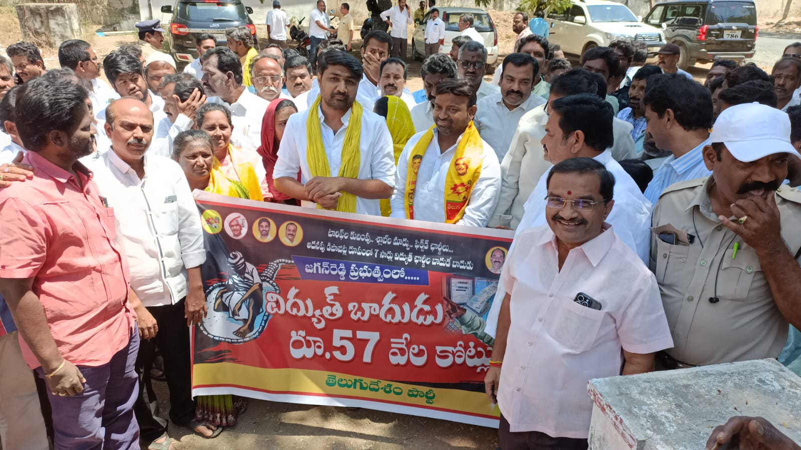 రాష్ట్రంలో వరుసగా ఎడవసారి పెంచిన విద్యుత్తు చార్జీలను నిరసిస్తూ తెలుగు దేశం పార్టీ అధిష్టానం ఆదేశాలమేరకు రాష్ట్ర వ్యాప్తంగా నిర్వహిస్తున్న ఆందోళనలో భాగంా నంద్యాల పట్టణంలోని విశ్వ నగర్ సబ్ స్టేషన్ వద్ద తెలుగుదేశం పార్టీ నియోజకవర్గ ఇంచార్జి భూమా బ్రహ్మానందరెడ్డి యువనేత ఫిరోజ్ ఆద్వర్యంలో తెలుగు తమ్ముళ్లు భారీ నిరసన ధర్నా నిర్వహించారు. ఈ సందర్భంగా మాజీ ఎం ఎల్ ఏ భూమా మాట్లాడుతూ వైసిపి ప్రభుత్వం అధికారంలోకి వచ్చాక ఇప్పటికే ఏడుసార్లు విద్యుత్ చార్జీలు పెంచి పేదోడి నడ్డి విరిచిందని ఆవేదన చెందారు.విద్యుత్ చార్జీల పెరుగు దలతో పరోక్షంగా అనేరకాలుగా ధరలు పెరిగి సామాన్యుడి బ్రతుకు దుర్భరం అయిందన్నారు..సంక్షేమం పేరుతో ఒక్క రూపాయి ఇస్తూ 100రూపాయలు ప్రజల జేబులకు జగన్ రెడ్డి ప్రభుత్వం చిల్లు పెడుతోంది అన్నారు..సంక్షేమ పదకాలు కొంతమందికి ఇచ్చి 80శాతం ప్రజలను రాష్ట్రాన్ని జగన్ ప్రభుత్వం నిట్టనిలువుగా ముంచేసి ఇప్పుడు జోలె పట్టుకుని ఇంటింటికి స్తిక్కర్లు ఏ ముఖం పెట్టుకొని అంటిస్తారు అని భూమా దుయ్యబట్టారు..స్థానిక ఎమ్మెల్యే ఆదివారం ఎం ఎల్ ఏ అని సాక్షాతూ వైసిపి కార్యకర్త నామకరణం చేశారని ఈయన ఏదో సందులో చిన్న రోడ్డు వేసి నాడు నేడు అని ఫోటోలు పెట్టడం హాస్యాస్పదం అన్నారు..ఆర్ ఎ ఆర్ ఎస్ భూములు నిర్వీర్యం చేసి మెడికల్ కాలేజ్ పేరుతో ప్రజలను రైతులను మోసం చేశారని భూమా విమర్శించారు..ప్రజలు అన్నీ గమనించి ఇటీవల చెప్పుతో కొట్టినట్లు ఎం ఎల్ సి పలితాలు ఇచ్చారన్నారు...ఫిరోజ్ మాట్లాడుతూ రాబోయే ఎన్నికల్లో తెలుగుదేశం పార్టీ ఆకండ విజయం సాధించడం ఖాయం అన్నారు..కార్యక్రమంలో తెలుగుదేశం నేతలు కార్యకర్తలు భారీగా పాల్గొన్నారు.