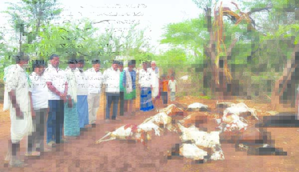 చనిపోయిన జీవాలను పరిశీలిస్తున్న టిడిపి నాయకులు మెట్టు శ్రీనివాసరెడ్డి తదితరులు