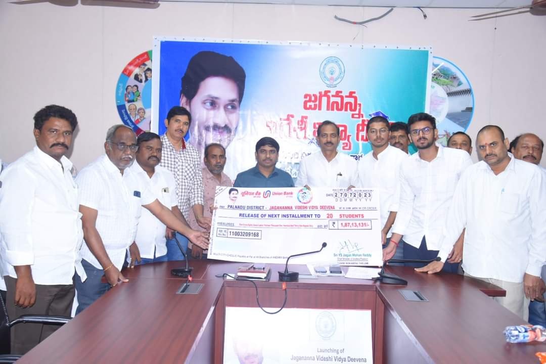 ప్రజాశక్తి - పల్నాడు జిల్లా : విదేశీ విద్యా దీవెనను విద్యార్థులు సద్వినియోగం చేసుకోవాలని జిల్లా కలెక్టర్ ఎల్.శివశంకర్, ఎమ్మెల్యే డాక్టర్ గోపిరెడ్డి శ్రీనివాసరెడ్డి అన్నారు. శుక్రవారం తాడేపల్లి క్యాంపు కార్యాలయం నుండి రెండో విడత విదేశీ విద్యా దీవెనను సిఎం జగన్మోహన్రెడ్డి ప్రారంభించారు. నరసరావుపేటలోని కలెక్టరేట్ నుండి వీడియో కాన్ఫరెన్స్ ద్వారా కలెక్టర్ఎ, ఎమ్మెల్యే, జిల్లా సంఘిక సంక్షేమ అధికారి ఓబుల నాయుడు, లబ్ధిదారులు పాల్గొ న్నారు. పల్నాడు జిల్లాకు సంబంధించి 18 మందికి రూ.1.57 కోట్ల అందించినట్లు కలెక్టర్ తెలిపారు. వి.సాయి ప్రశాంత్కు రూ.14,34,395, వై.సాయి అరవింద్కు రూ:15,91,631 మంజూరు కాగా లబ్ధిదార్లతో కలెక్టర్ మాట్లాడి వారి లక్ష్యాలను అడిగి తెలుసుకున్నారు. ఈ సందర్భంగా మెగా చెక్కును అందించారు.