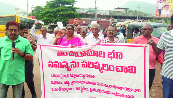 పంచ గ్రామాల భూ సమస్యను పరిష్కరించాలని కోరుతూ సమైక్య ప్రజా, రైతు సంక్షేమ సంఘం ఆధ్వర్యాన గురువారం సింహాచలం తొలి పావంచా నుంచి గోపాలపట్నం పెట్రోల్ బంక్ వరకు ర్యాలీ నిర్వహించారు. ఈ సందర్భంగా సంఘం నాయకులు మాట్లాడుతూ, పంచ గ్రామాల భూ సమస్యను పరిష్కరిస్తామని చెప్పి అధికారాన్ని చేపడుతున్న ప్రభుత్వాలు తర్వాత కల్లబొల్లి కబుర్లు చెబుతున్నారని విమర్శించారు. ఈ సమస్యను పరిష్కరిస్తామని చెప్పి గద్దెనెక్కిన వైసిపి ప్రభుత్వం నాలుగేళ్లలో చేసిందేమీ లేదన్నారు. సమస్య ఎక్కడ వేసిన గొంగలి అక్కడే అన్న చందంగా ఉందని ఎద్దేవాచేశారు. కనీసం మరమ్మతులకు గురైన ఇళ్లను బాగుచేసుకునేందుకు కూడా అనుమతి ఇవ్వడంలేదని ఆవేదన వ్యక్తంచేశారు. మరమ్మతులు కోసం పలుమార్లు ప్రభుత్వం దృష్టికి తీసుకెళ్తే జిల్లా అధికారులు, మంత్రులు, ప్రజా ప్రతినిధులు స్పందిస్తూ ఇళ్ల మరమ్మతులు చేసుకోవచ్చని తెలిపారని, కానీ ఆచరణలో మాత్రం దేవస్థానం అధికారులు అడ్డుకుంటున్నారని వివరించారు. ఎన్నో ఏళ్ల క్రితం నిర్మించిన ఇళ్లకు మరమ్మతులు చేసుకోకపోతే గోడలు పడిపోయే పరిస్థితి ఉందన్నారు.