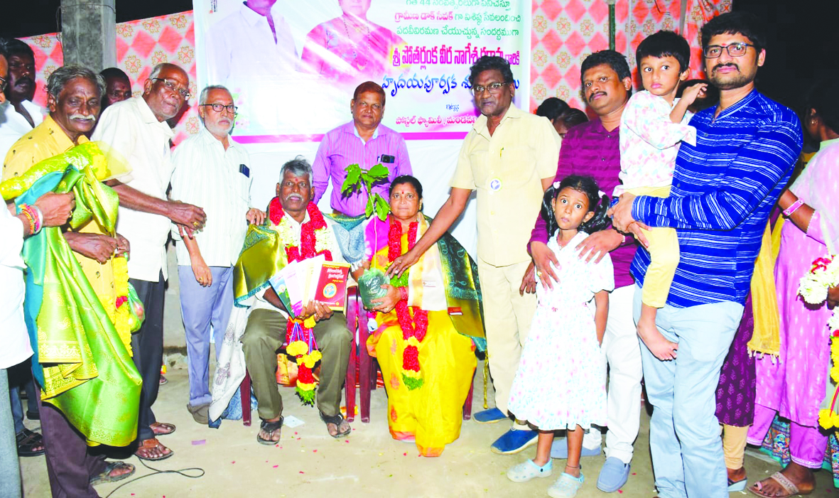 ఉత్తరాలు అందించే పోస్ట్మెన్గా పోతర్లంక వీరనాగేశ్వరరావు విశిష్ట సేవలందించారని సుధామ ఫౌండేషన్ వ్యవస్థాపకులు, ప్రొఫెసర్ విజయకుమార్ తెలిపారు. స్థానిక పోస్టాఫీస్లో గురువారం నిర్వహించిన వీర నాగేశ్వరరావు ఉద్యోగ విరమణ కార్యక్రమంలో ఆయన ముఖ్య అతిథిగా పాల్గొని మాట్లాడారు. వీరనాగేశ్వరరావు 44 ఏళ్ల పాటు పోస్ట్మెన్గా పని చేశారన్నారు. ఇంటింటికి తిరిగి ఉత్తరాలను అందించారన్నారు. ఉత్తరాలు అందించే క్రమంలో ఆయన ఎంతో మర్యాదగా నడుచుకుంటూ చిరునవ్వుతో అందరిని అప్యాయంగా పలకరించేవారన్నారు. ప్రజాస్వామ్య పరిరక్షణ సభ్యులు ఎల్ఎస్.భాస్కరరావు మాట్లాడుతూ మంచి వ్యక్తిత్వం గల మనిషి నాగేశ్వరరావు అన్నారు. ఉద్యోగ విరమణ అనంతరం ఆనందంగా గడుపుతూ కొంత సమయం పర్యావరణ పరిరక్షణలో, ప్రజాసేవలో కొనసాగాలని ఆయన కోరారు. చిరకాలం గుర్తుండిపోయేలా రాజ్యాంగంతో పాటు మంచి మంచి పుస్తకాలు, పచ్చటి మొక్కను అందించి మొక్కను నాటి సంరక్షించాలని ఆయన తెలిపారు. అనంతరం నాగేశ్వరరావు దంపతులను దుశ్శాలువాలతో, పూలమాలతో ఘనంగా సత్కరించారు. ఈ కార్యక్రమంలో ప్రజాస్వామ్య పరిరక్షణ ఐక్యవేదిక మండల అధ్యక్షులు అప్పారావు, పిఎసిఎస్ అధ్యక్షుడు గోకర్ణ యాదవ్, రిటైర్డ్ టీచర్ బి.కొండయ్య, రామ్మోహన్, మెండ సురేష్, మండవల్లి, కైకలూరు, కలిదిండి, ముదినేపల్లి సబ్ పోస్ట్మాస్టర్లు పాల్గొన్నారు.
