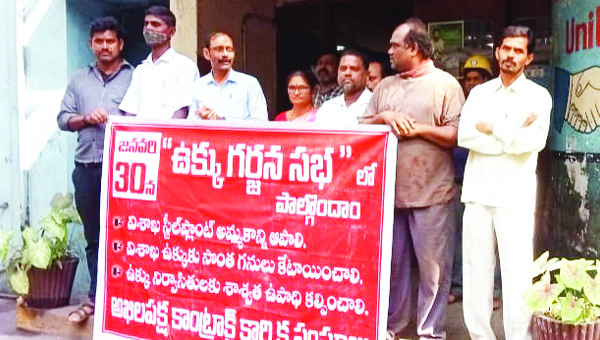 ఉక్కునగరం :ఉక్కు త్రిష్ణా గ్రౌండ్లో ఈ నెల 30వ తేదీన జరిగే ఉక్కు ప్రజా గర్జన బహిరంగ సభలో ఉక్కు కాంట్రాక్టు కార్మికుల కుటుంబ సభ్యులు పాల్గొని విజయవంతం చేయాలని ఉక్కు అఖిలపక్ష కాంట్రాక్టు కార్మిక సంఘాల ఆధ్వర్యాన ఎల్ఎంఎంఎం పార్కు వద్ద పోస్టర్ను ఆవిష్కరించారు. స్టీల్ప్లాంట్లోని వివిధ విభాగాల్లో ప్రచార కార్యక్రమాలను చేపట్టారు. ఈ సందర్భంగా నాయకులు మాట్లాడుతూ, 32 మంది బలిదానంతో విశాఖ ఉక్కు ఆంధ్రుల హక్కు అనే నినాదంతో పోరాడి సాధించుకున్న స్టీల్ప్లాంటను ఎట్టిపరిస్థితిలోనూ ప్రైవేటు వ్యక్తులకు ధారాదత్తం చేయడాన్ని సహించేది లేదని హెచ్చరించారు. ఈ కార్యక్రమంలో నాయకులు ఒవి రావు, జి.శ్రీనివాసరావు, నమ్మి రమణ, బొడ్డ గోవిందు, పిట్టా రెడ్డి, మురళీకృష్ణ, సత్యారావు, త్రినాథ్రెడ్డి, గురునాధ్రెడ్డి, డి.పాండే, కె.సత్యవతి, యు.సోమేష్, పి.మసేను, చట్టి నర్సింగరావు తదితరులు పాల్గొన్నారు.