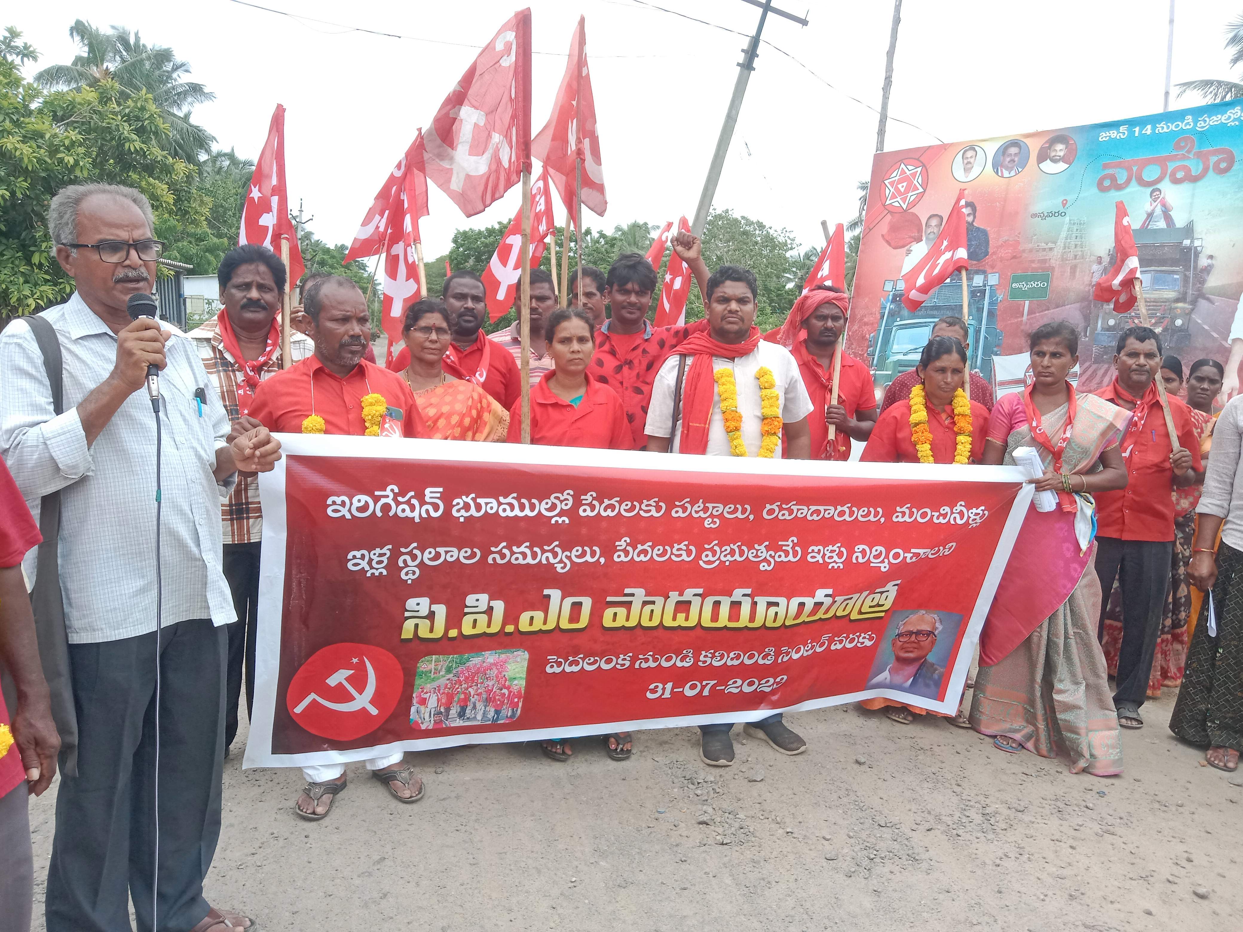 అత్యధిక తలసరి ఆదాయం కలిగి కేంద్ర, రాష్ట్ర ప్రభుత్వాలకు కోట్లాది రూపాయాల ఆదాయాన్ని సమకూరుస్తున్న కలిదిండి మండలాన్ని రాష్ట్ర ప్రభుత్వం విస్మరించడం శోచనీయమని సిపిఎం నేతలు పేర్కొన్నారు. సిపిఎం మండల కమిటీ ఆధ్వర్యంలో ప్రజాసమస్యల పరిష్కారానికి పెదలంక నుండి కలిదిండి వరకూ పాదయాత్ర సోమవారం సాగింది. ఈ పాదయాత్రను సిపిఎం జిల్లా కార్యదర్శి ఎ.రవి జెండా ఊపి ప్రారంభించారు. పాదయాత్రకు గ్రామ గ్రామాన ఆటో, బిల్డింగ్ వర్కర్స్, సిఐటియు, టిడిపి, మహాసేన, బేడ, బుడగ జంగం నాయకులు ఘనస్వాగతం పలుకుతూ తమ సంఘభావాన్ని తెలిపారు. పెదలంక, మూలలంక, భాస్కరరావు పేట, సంతోషపురం, గుర్వాయిపాలెం, కలిదిండి గ్రామాల్లో జరిగిన బహిరంగ సభల్లో రవి, జిల్లా కార్యవర్గ సభ్యులు పి.రామకృష్ణ, డిఎన్విడి.ప్రసాద్, మండల కార్యదర్శి ఎస్.మహంకాళిరావు మాట్లాడారు. అత్యధిక తలసరి ఆదాయం కలిగిన మండలంగా, 90 శాతం ఆక్వా సాగుతో ఉండి, సెజ్ రూపంలో, విదేశీ మారక ద్రవ్యం రూపంలోనూ వందల కోట్ల రూపాయలు ప్రభుత్వాలకు వస్తుందన్నారు. కానీ మండల ప్రజలకు సరైన తాగునీరు అందించడం గానీ, గుంతలు పడిన రోడ్లకు మరమ్మతులు చేయకపోవడం శోచనీయమన్నారు. పలుగ్రామాల్లో ఇరిగేషన్ భూముల్లో ఇంటి పన్ను, విద్యుత్, కుళాయి ఛార్జీలు చెల్లిస్తూ తరతరాలుగా వెయ్యి కుటుంబాలకుపైగా నివాసముంటున్న వారికి నేటికీ పట్టాలు ఇవ్వక పోవడం దారుణమన్నారు. ఎన్నికల ముందు స్థానిక ఎంఎల్ఎ దూలం నాగేశ్వరరావు ఇచ్చిన హామీని తుంగలో తొక్కారన్నారు. ఆక్వా జోన్గా ప్రకటించారే గానీ, సరైన తాగునీరు అందించడంలో విఫలమయ్యారన్నారు. ఈ జోన్ పరిధిలో ప్రజలు అత్యధికంగా కేన్సర్, కిడ్నీ వ్యాధుల బారిన పడుతున్నారన్నారు. శుద్ది చేసిన తాగునీరు అందించాలని, అర్హులకు ఇళ్ల పట్టాలు మంజూరు చేయాలని, జగనన్న కాలనీల్లో ప్రభుత్వమే ఇళ్లు కట్టివ్వాలని, కాలనీల్లో మౌలిక సదుపాయాలు కల్పించాలనే పలు డిమాండ్లతో వినతి పత్రాన్ని తహశీల్దార్ వంశీకి అందజేశారు. సిపిఎం మండల కమిటీ సభ్యులు వీరవల్లి భాస్కరరావు, అద్దాని వెంకటేశ్వరరావు, చిప్పాడ దుర్గాప్రసాద్ దొర, జక్కుల మహేష్, చిన్నం శ్రీకాంత్, వెంకమ్మ, బుస్సా శివలీల, వీరవల్లి వరలక్ష్మి, ఎస్.మహాలక్ష్మీ, టిడిపి బిసి సెల్ రాష్ట్ర కార్యదర్శి అండ్రాజు శ్రీనివాసరావు, జిల్లా అధ్యక్షులు రెడ్డి శ్రీనివాస చక్రవర్తి, మహాసేన నియోజక వర్గ అద్యక్షులు చాబత్తిన రాజు, బెడ బుడగ జంగాల సంఘం రాష్ట్ర కోశాధికారి బైలపాటి నాగ శ్రీనివాసరావు పాల్గొన్నారు.