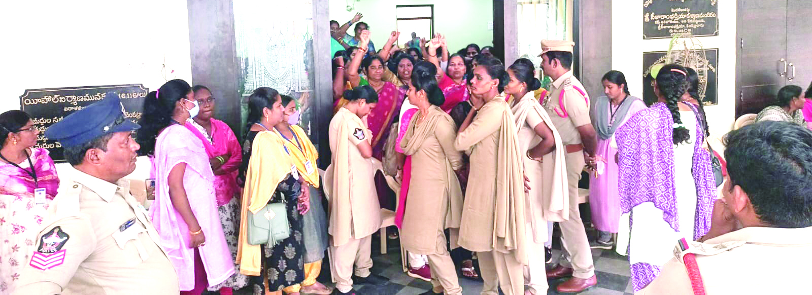 అంగన్వాడీలపై ప్రభుత్వం సాగించిన నిర్బంధకాండ చూసి మనం ప్రజాస్వామ్య పాలనలో ఉన్నామా.. లేక రాచరిక పాలనలో ఉన్నామా అనే అనుమానం కలుగుతోంది. తమ సమస్యల పరిష్కారం కోసం సోమవారం చలో విజయవాడ కార్యక్రమానికి వెళ్తున్న అంగన్వాడీలపై ప్రభుత్వం వ్యవహరించిన తీరు అత్యంత దారుణంగా ఉంది. ప్రజాస్వామ్యంలో నిరసన తెలిపే హక్కు ప్రతిఒక్కరికీ ఉంటుంది. ప్రజల హక్కులను కాలరాస్తూ వైసిపి ప్రభుత్వం నిరంకుశ ధోరణిలో ముందుకు సాగుతోంది. వాహనాల్లో వెళ్తున్న వివిధ జిల్లాలకు చెందిన అంగన్వాడీలను ఏలూరు కలపర్రు టోల్గేట్ వద్ద అడ్డగించిన పోలీసులు తీవ్ర నిర్బంధం ప్రయోగించారు. తూర్పుగోదావరి, విశాఖతోపాటు జిల్లాలోని పలు మండలాలకు చెందిన అంగన్వాడీలను విజయవాడ వెళ్లకుండా అడ్డుకుని పోలీస్స్టేషన్లకు తరలించి నిర్బంధించారు. ఉదయం నుంచి మధ్యాహ్నం మూడుగంటల వరకూ టిఫిన్, తాగునీరు లేక, పోలీస్స్టేషన్ల వద్ద మరుగుదొడ్లు వంటివి లేక అంగన్వాడీలు పడ్డ ఇబ్బందులు వర్ణనాతీతం. జిల్లాతోపాటు వివిధ జిల్లాలకు చెందిన అంగన్వాడీలను కలపర్రు టోల్గేట్ వద్ద అడ్డుకుని పెదపాడు, ఏలూరు రూరల్ పోలీస్స్టేషన్లకు తరలించారు. విషయం తెలుసుకుని అక్కడకు చేరిన సిఐటియు నాయకులు అంగన్వాడీలతో కలిసి పోలీస్స్టేషన్ ఎదుట బైఠాయించి ఆందోళనలు చేపట్టారు. దీంతో ఏలూరు వన్టౌన్ పెరుగుచెట్టు సమీపంలోని శ్రీ సీతారామ భర్తియా కల్యాణ మండపంలో దాదాపు 150 మంది అంగన్వాడీలను నిర్బంధించి గేట్లు మూసివేశారు. దీంతో నిర్బంధించిన అంగన్వాడీలను విడుదల చేయాలని సిఐటియు నాయకులు ఆర్.లింగరాజు, బి.సోమయ్యతోపాటు పలువురు నాయకులు అక్కడకు చేరుకుని రోడ్డుపై పడుకుని నిరసన చేపట్టారు. సిఎం డౌన్డౌన్ అంటూ అంగన్వాడీలు చేసిన నినాదాలు హోరెత్తాయి. సచివాలయ మహిళా పోలీసులను రంగంలోకి దించి అంగన్వాడీలపై తీవ్ర నిర్బంధం ప్రయోగించిన పరిస్థితి ఉంది. జంగారెడ్డిగూడెం, చింతలపూడి, పెదపాడు, నూజివీడు, ఉంగుటూరు, భీమవరం, తణుకు, పాలకొల్లు, నరసాపురం తదితర ప్రాంతాల్లో అంగన్వాడీలపై తీవ్ర నిర్బంధకాండ సాగింది. తాము అధికారంలోకి వస్తే తెలంగాణ రాష్ట్రం కంటే అదనంగా రూ.వెయ్యి వేతనం ఇస్తామని చెప్పిన వైసిపి నాలుగేళ్లయినా ఆ ఊసే మరిచిపోయింది. కనీస వేతనం అమలు చేయాలని, ఉద్యోగ విరమణ బెనిఫిట్స్ అందించాలని, ఫేస్యాప్ రద్దు చేయాలని, జీతాలు, ఇతర బకాయిలు వెంటనే చెల్లించాలనే డిమాండ్లతో చలో విజయవాడకు అంగన్వాడీ వర్కర్స్ అండ్ హెల్పర్స్ యూనియన్ (సిఐటియు) పిలుపునిచ్చింది. ఈ కార్యక్రమంలో పాల్గొనేందుకు వెళ్తున్న అంగన్వాడీలను ప్రభుత్వం తీవ్ర ఇబ్బందులకు గురిచేసింది. గతంలో టిడిపి ప్రభుత్వ హాయాంలోనూ ఇదేవిధంగా అంగన్వాడీలను ఇబ్బంది పెట్టిన పరిస్థితి ఉంది. అదే టిడిపి పత
