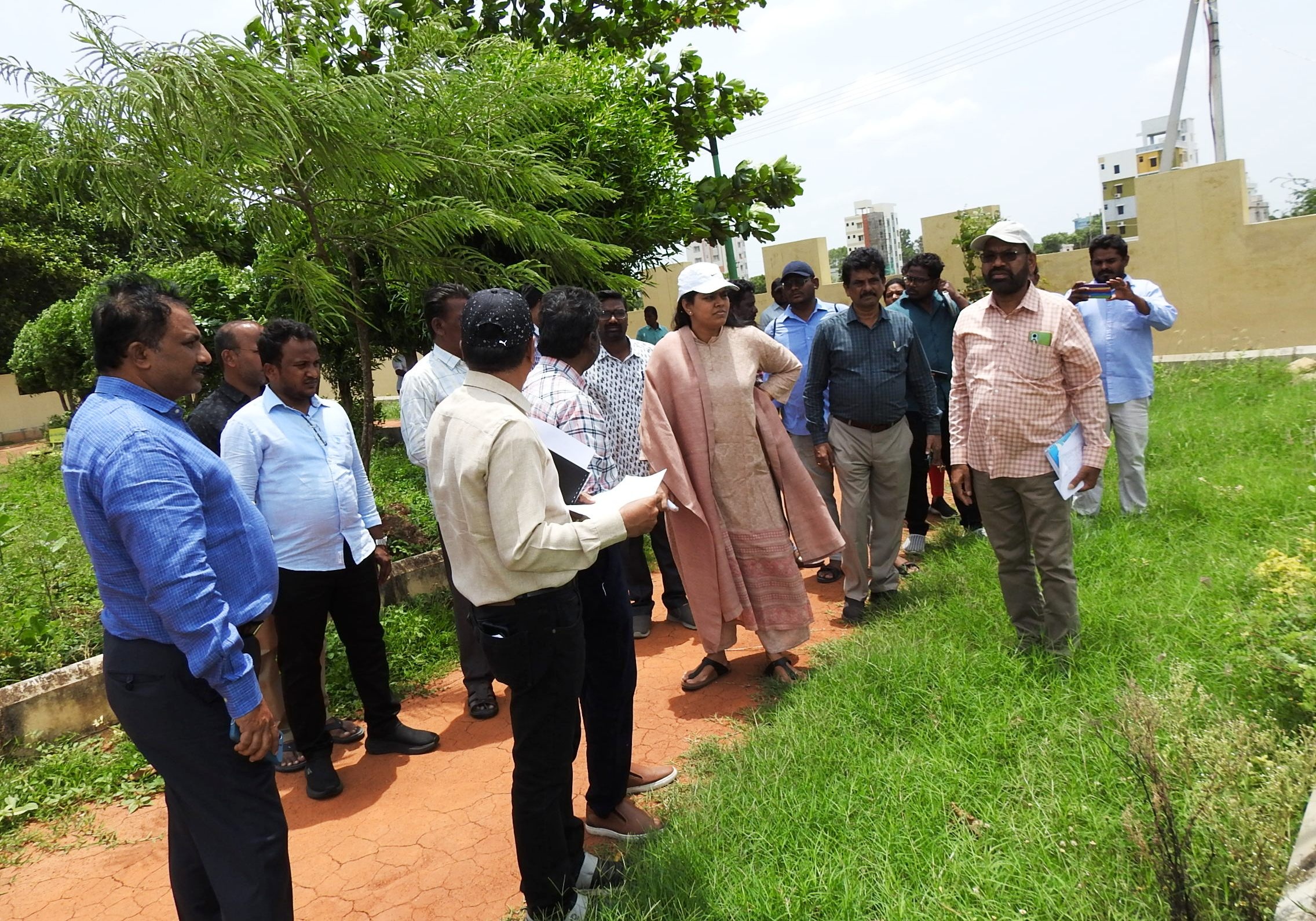 పార్కుల పరిశీలనలో భాగంగా అధికారులు, సిబ్బందితో మాట్లాడుతున్న కమిషనర్