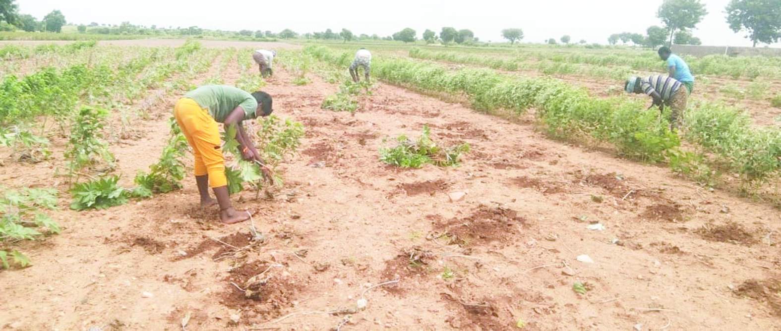 ఎండిపోయిన ఆముదం పంటను తొలగిస్తున్న కూలీలు