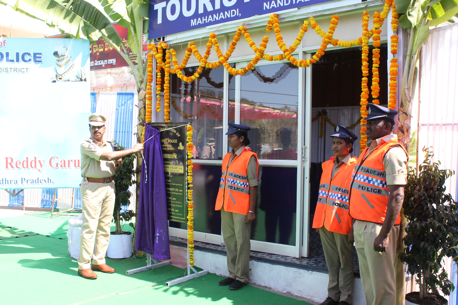 పర్యాటకుల భద్రతే లక్ష్యంగా టూరిస్ట్ పోలీస్ స్టేషన్ల ఏర్పాటుకు రాష్ట్ర ప్రభుత్వం తీసుకున్న నిర్ణయం చిరస్మరణీయమని నంద్యాల జిల్లా ఎస్పి రఘువీర్ రెడ్డి అన్నారు. రాష్ట్ర వ్యాప్తంగా సుమారు 20 టూరిస్ట్ పోలీసు స్టేషన్లను ముఖ్యమంత్రి వైఎస్ జగన్మోహన్రెడ్డి మంగళవారం తాడేపల్లిలోని క్యాంపు కార్యాలయం నుంచి వర్చువల్గా జెండా ఊపి ప్రారంభించారు. మహానంది క్షేత్రంలో ఏర్పాటు చేసిన టూరిస్టు పోలీస్ స్టేషన్ ప్రారంభోత్సవంలో జిల్లా ఎస్పి పాల్గొని మాట్లాడారు. పర్యాటక ప్రాంతాలు, ఆధ్యాత్మిక ప్రదేశాలను సందర్శించే వారి భద్రత కోసం ప్రత్యేకంగా టూరిస్ట్ పోలీస్ స్టేషన్లు లోకల్ పోలీస్ స్టేషన్లతో అనుసంధానమై ఉంటాయని అన్నారు. ప్రతి టూరిస్ట్ పోలీస్ స్టేషన్లో 6 మంది సిబ్బంది షిఫ్ట్ డ్యూటీలుగా పని చేస్తారని తెలిపారు. వీరిలో సగం ఆడవారు, సగం మగవారు పని చేస్తారని చెప్పారు. టూరిస్ట్ పోలీస్ స్టేషన్కు ప్రత్యేక టెలిఫోన్ నెంబరు ఏర్పాటు చేస్తామని, ఒక విహెచ్ఎఫ్ సెట్, ఫస్ట్ ఎయిడ్ బాక్స్, ఆ ప్రాంతానికి సంబంధించిన మ్యాపు, ఎమర్జెన్సీ టెలిఫోన్ నంబర్స్, ఆ ప్రాంతంలో ఉన్న పర్యాటకులకు భద్రత కల్పిస్తారని తెలిపారు. నంద్యాల జిల్లాలో మహానంది, అహౌబిలం, శ్రీశైలం పర్యాటక ప్రదేశాలుగా ఉన్నాయని, శ్రీశైలంలో కూడా టూరిస్ట్ పోలీస్ స్టేషన్ త్వరలో ఏర్పాటు చేస్తామన్నారు. అసాంఘీక కార్యకలాపాలకు అడ్డుకట్ట, నేరాల నియంత్రణే లక్ష్యంగా దేవదాయ శాఖను సమన్వయం చేసుకుంటూ ప్రజలకు మెరుగైన సేవలు అందిస్తామని తెలిపారు. కార్యక్రమంలో మహానంది ఆలయ ఇఒ చంద్రశేఖర్ రెడ్డి, పాలక మండలి చైర్మన్ మహేశ్వర్ రెడ్డి, నంద్యాల డిఎస్పి మహేశ్వర్ రెడ్డి, రూరల్ సిఐ రవీంద్ర, మహానంది ఎస్సై నాగార్జున రెడ్డి, పోలీస్ సిబ్బంది, ఆలయ అధికారులు పాల్గొన్నారు.