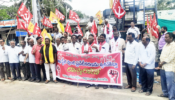 ప్రజాశక్తి-మంగళగిరి : విశాఖ ఉక్కు ఫ్యాక్టరీ కేంద్రంలోని బిజెపి ప్రభుత్వం ప్రవేటికరించడానికి వ్యతిరేకిస్తూ సిపిఎం, సిపిఐ, టిడిపి, కార్మిక సంఘాల ఆధ్వర్యంలో బుధవారం అంబేద్కర్ సెంటర్ వద్ద ధర్నా కార్యక్రమం జరిగింది. తొలుత ఆయా పార్టీల కార్యాలయం నుండి ప్రదర్శనగా అంబేద్కర్ సెంటర్ కు చేరుకున్నారు. ఈ సందర్భంగా జరిగిన ధర్నా కార్యక్రమంలో సిపిఎం గుంటూరు జిల్లా కార్యదర్శి వర్గ సభ్యులు ఎస్ ఎస్ చేంగాయ్య, ఏఐటీయూసీ జిల్లా కార్యదర్శి ఎం హనుమంతరావు, సిపిఐ నియోజకవర్ కార్యదర్శి చిన్ని తిరుపతయ్య, సిపిఎం సీనియర్ నాయకులు జెవి రాఘవులు, టిడిపి నాయకులు వాదం మాధవరావు మాట్లాడారు. విశాఖ ఉక్కు ఫ్యాక్టరీ ఎన్నో పోరాటాలు చేసి సాధించుకోవడం జరిగిందని వివరించారు. లక్షల కోట్ల రూపాయలు విలువ చేసే ఫ్యాక్టరీని వేల కోట్ల రూపాయలకు కారు సౌకగా పెట్టుకోదారులకు అమ్మడానికి మోడీ ప్రభుత్వం చూస్తుందని అన్నారు. మోడీ కార్మిక వ్యతిరేక విధానాలను అవలంబిస్తున్నారని విమర్శించారు. కొంతమంది ప్రాణాల త్యాగాలతో విశాఖ ఉక్కు ఫ్యాక్టరీని సాధించడం జరిగిందని తెలిపారు. లక్షలాది మందికి ఉపాధి కల్పిస్తుందని తెలిపారు. మోడీ ప్రభుత్వం చేస్తున్న విధానాన్ని రాష్ట్ర ప్రజలందరూ సమైక్యంగా ఉండి త్రిప్పి కొట్టాలని పిలుపునిచ్చారు. ఈ కార్యక్రమంలో సిపిఎం సీనియర్ నాయకులు పి బాలకృష్ణ, పట్టణ నాయకులు ఎస్ గణేష్, బి స్వామినాథ్, టి హేమసుందర్ రావ్, సిపిఐ నాయకులు వై వెంకటేశ్వరరావు, జాలాది జాన్ బాబు, ఏ ప్రభాకర్, పి నాగేశ్వరరావు, ఏఐటియుసి నాయకులు చిన్ని సత్యనారాయణ, టిడిపి నాయకులు గోవాడ దుర్గారావు, సింహాద్రి రామారావు, సిహెచ్ వెంకటేశ్వరరావు, ఏ నాగబాబు తదితరులు పాల్గొన్నారు.