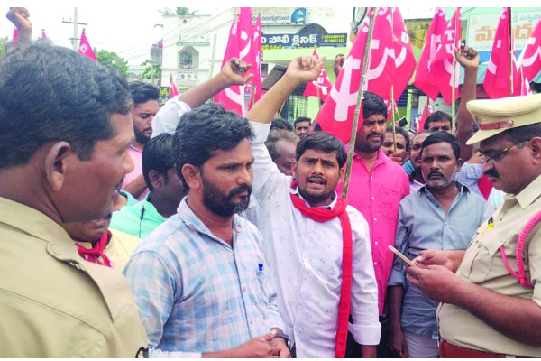 పెద్దాపురం : మంత్రి దాడిశెట్టి రాజా వద్దకు వెళుతున్న భవన నిర్మాణ కార్మికులను అరెస్టు చేయడానికి నిరసిస్తూ పెద్దాపురం మెయిన్ రోడ్ వినాయకుని గుడి సెంటర్లో సిఐటియు ఆధ్వర్యంలో ఆందోళన చేపట్టారు. ఈ సందర్భంగా పలువురు మాట్లాడుతూ ముఖ్యమంత్రి జగన్మోహన్ రెడ్డి కార్మిక వ్యతిరేక విధానాలు అవలంబిస్తున్నారన్నారు. సంక్షేమ బోర్డును సాధించేంతవరకు భవన నిర్మాణ కార్మికులు నిర్బంధాలను లెక్కచేయకుండా పోరాటాలు చేస్తారన్నారు. ఈ కార్యక్రమంలో సిఐటియు నాయకులు నీలపాల సూరిబాబు, సిరపరపు శ్రీనివాస్, యాసలపు రమేష్, టిఎల్.పద్మావతి, స్నేహలత, సావిత్రి, భవన నిర్మాణ కార్మిక సంఘం నాయకులు తైనాల శ్రీను, గూనూరు వెంకటరమణ, డి.శివ, ముమ్మన నాగు, గడపా వీరబాబు, ఆరు వీర్రాజు, డి.కృష్ణ పాల్గొన్నారు.