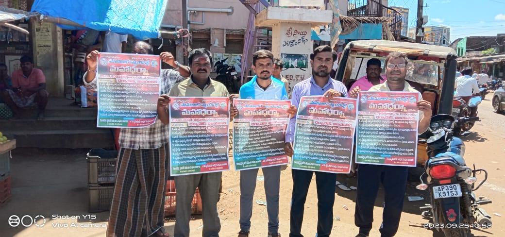 వరదయ్యపాళెంలో... మైనార్టీ నాయకులు బాష ఆధ్వర్యంలో గోడపత్రికను ఆవిష్కరించారు. విజయవాడలో జరిగే మహాధర్నాను జయప్రదం చేయాలని కోరారు. దళిత గిరిజనులకు 200 యూనిట్లు ఉన్న ఉచిత విద్యుత్ను 300 యూనిట్లకు పెంచాలన్నారు. మిగులు భూములు ప్రజలకు పంచాలని, డప్పు కళాకారులకు పింఛన్ ఐదువేలు ఇవ్వాలని డిమాండ్ చేశారు.