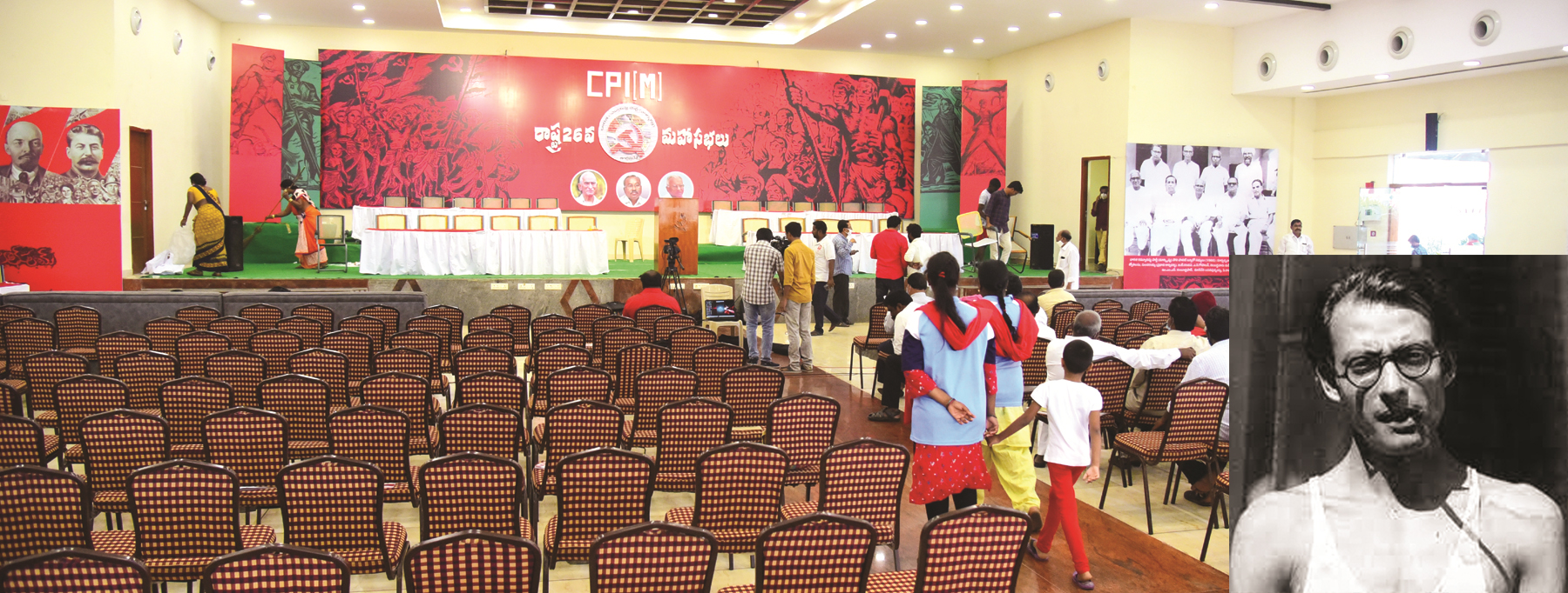సిపిఎం మహాసభల వేదికను స్ఫూర్తిదాయకమైన సమరశీల చిత్రాలతో తీర్చిదిద్దారు. వేదికకు ఒకవైపు సామ్యవాద సిద్ధాంత కర్తలు కారల్మార్క్స్, ఎంగెల్స్, లెనిన్, స్టాలిన్ నిలువెత్తు చిత్రపటం; మరోపక్క సిపిఎం తొలి పొలిట్ బ్యూరో సభ్యుల బ్యానర్ అమర్చారు. వేదిక వెనుక భాగాన్ని ప్రఖ్యాత చిత్రకారుడు చిత్తప్రసాద్ గీసిన చారిత్రిక చిత్రాలతో తీర్చిదిద్దారు. సంకెళ్లను తెంచుకొని సమరశీలంగా ఉరకలెత్తుతున్న సామాన్యులు, ఐక్యంగా చైతన్యవంతంగా కదులుతున్న కార్మిక కర్షకులు ... చిత్త ప్రసాద్ కుంచె ప్రావీణ్యంతో అద్భుత నేపథ్యంగా అమర్చారు. అమర వీరుల స్థూపం దగ్గర కూడా విప్లవాంజలి ఘటిస్తున్న సామాన్యుల చిత్రం చిత్తప్రసాద్ గీచినదే ప్రదర్శించారు.