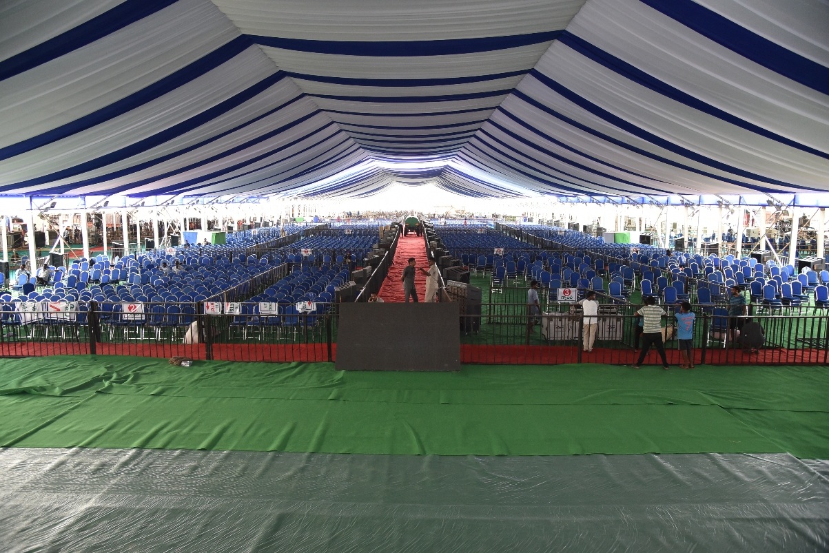 ముఖ్యమంత్రి కరకట్ట గుండా కొత్తగా నిర్మించిన రోడ్డు మీదుగా సభాస్థలికి చేరుకుంటారు. వెంకటపాలెంలోని శ్రీ వెంకటేశ్వర స్వామి గుడికి ఎదురుగా సీడ్ యాక్సెస్ రోడ్డు పక్కన సుమారు 20 ఎకరాల్లో సభ ఏర్పాటు చేస్తున్నారు. పంచాయతీ, గ్రామీణ నీటి సరఫరా విభాగం, ఆర్ అండ్ బి, పోలీసు తదితర శాఖలు సభా ఏర్పాట్లలో నిమగమయ్యారు. సభా వేదికకు కుడి వైపు విఐపిలకు ప్రత్యేక గ్యాలరీలను కేటాయించారు. మొత్తం 46 గ్యాలరీ ఏర్పాటు చేశారు. ఎండ తీవ్రతను దృష్టిలో పెట్టుకొని సభకు వచ్చే వారికి ఇబ్బంది కలగకుండా సుమారు లక్ష వాటర్ పాకెట్లను అధికారులు సిద్ధం చేస్తున్నారు. సభతో పాటు పరిసరాలను పరిశుభ్రంగా ఉంచేందుకు పారిశుధ్య, పంచాయతీ కార్మికుల సేవలను వినియోగించు కుంటున్నారు. ముఖ్యమంత్రి సభకు వచ్చే మార్గాల్లో పిచ్చి చెట్లను తొలగించారు. సభకు దారితీసే మార్గాల్లో పోలీసులు తనిఖీలు చేశారు. కృష్ణా కరకట్ట రోడ్డు మార్గంలో విస్తృత తనిఖీలు చేపట్టారు.