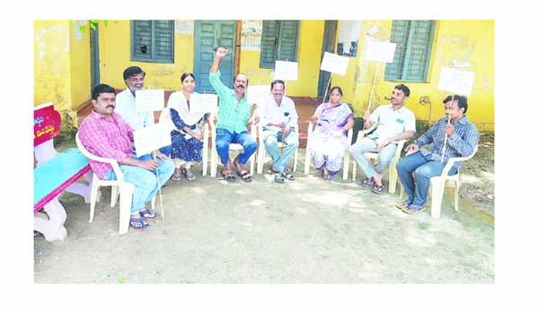 పూసపాటిరేగ : ప్రభుత్వం తమ సమస్యలను పరిష్కరించాలని కోరుతూ మండల విద్యాశాఖ కార్యాలయ ఉద్యోగులు సోమవారం విధులకు హాజరు కాకుండా కార్యాలయం ఎదుట నిరసన దీక్ష చేపట్టారు. ఈ సందర్భంగా వారు మాట్లాడుతూ తమను రెగ్యులరైజ్ చేస్తామని ముఖ్యమంత్రి తన పాదయాత్ర సమయంలో హామీ ఇచ్చారని తెలిపారు. తమకు కనీస వేతన స్కేలు కూడా ఇవ్వడానికి ప్రభుత్వం కుంటిసాకులు చూపిస్తొందని ఆవేదన వ్యక్తం చేసారు. వేతనాలు సకాలంలో అందేటట్లు చర్యలు తీసుకోవాలన్నారు. ఈ కార్యక్రమంలో ఎంఇఒ కార్యాలయ సిబ్బంది, పాల్గొన్నారు..