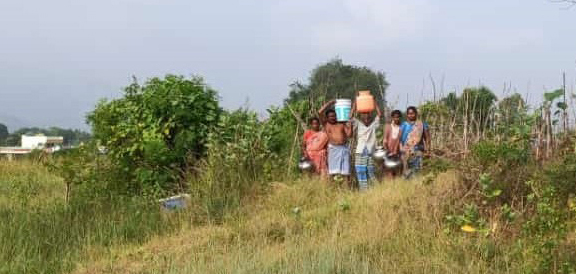 ప్రజాశక్తి-సోమల ఆ గ్రామానికి నీటి కష్టం వచ్చింది. ఊరికి వచ్చే పైపు లైన్లో చెత్త పేరుకుపోవడంతో నీళ్లు నిలిచిపోయాయి. పైపులు మరమ్మత్తులు చేయకపోవడంతో సమస్య తలెత్తింది. గత్యంతరం లేక గ్రామస్తులు పంట పొలాల బాటపట్టారు. బిందెలతో నీళ్లు తెచ్చుకొంటూ కాలం నెట్టుకొస్తున్నారు. ఒకటి, రెండు వారాలు కాదు.. రెండు నెలలుగా ఇదే పరిస్థితి. ప్రజాప్రతి నిధులకు, అధికారులకు మొరపెట్టుకున్నా.. పరిష్కారం దొరకలేదు. ఇదీ సోమల మండలం అడుసుపల్లి గ్రామం నజంపేట దళితవాడ కుటుంబాల పరిస్థితి. పొలాల గట్లపై నుంచి మహిళలు బిందెలతో వస్తున్న ఆ చిత్రం సోమవారం ప్రజాశక్తి కెమెరాకు చిక్కింది. వారిని విచారించగా.. రెండు నెలలుగా నీళ్లు రాకపోవడం ఇబ్బంది పడుతున్నామని గ్రామస్తులు ఆవేదన వ్యక్తం చేశారు. నీటి సరఫరా ఆగిపోవడంతో కూలీ పనులు మానుకొని వ్యవసాయ బోర్లలో నీళ్లు తెచ్చుకోవాల్సిన పరిస్థితి దాపరించిందని అసహనం వ్యక్తం చేశారు. ఇప్పటికైనా అధికారులు స్పందించి చర్యలు తీసుకోవాలని వేడుకున్నారు.