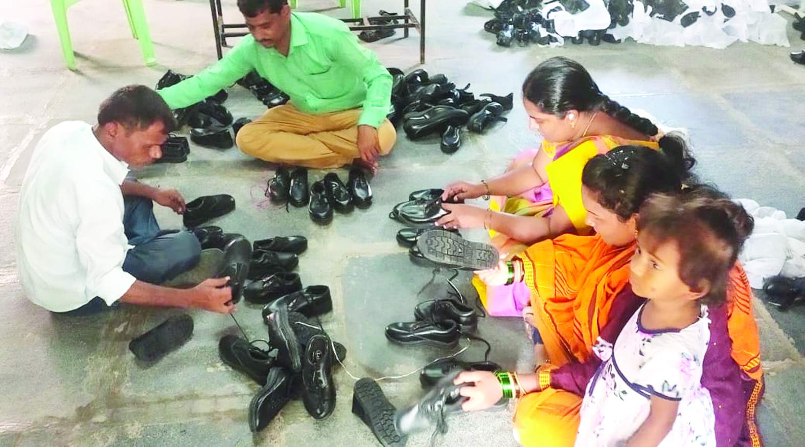 బూట్లను పరిశీలిస్తున్న విద్యార్థుల తల్లిదండ్రులు