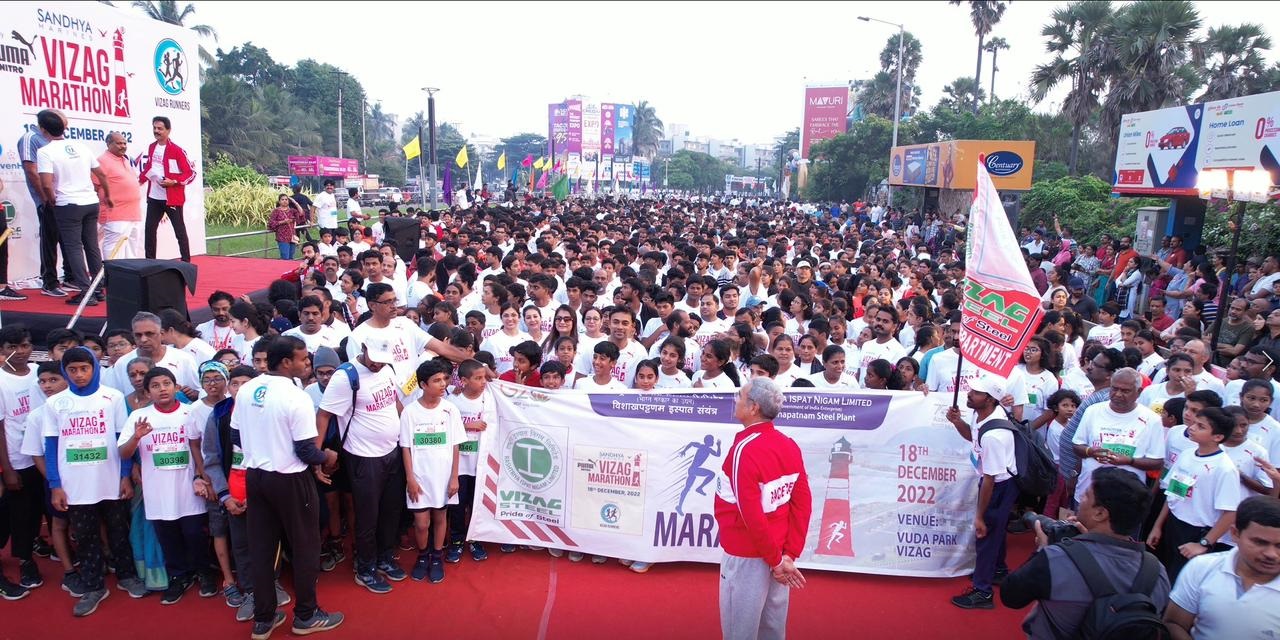 ప్రజాశక్తి- సీతమ్మధార : ప్లాస్టిక్, మత్తు పదార్ధాల వల్ల కలిగే దుష్ప్రయోజనాలను వివరిస్తూ నగర ప్రజలకు ఆరోగ్యంపై అవగాహన కల్పిస్తూ, వైజాగ్ రన్నర్స్ సొసైటీ ఆధ్వర్యంలో ఆదివారం ఉదయం సంధ్యా మెరైన్స్ సాగరతీరంలో నిర్వహించిన వైజాగ్ మారథాన్ ఉల్లాసభరిత వాతావరణంగా సాగింది. 21కె, 10కె, 5కె, 3కె నాలుగు విభాగాల్లో నిర్వహించిన మారథాన్లో నగరవాసులతో పాటు దేశం నలుమూలల నుంచి వయోభేదం లేకుండా తరలివచ్చిన వేలాదిమంది ఔత్సాహికులు పాల్గొన్నారు. మారథాన్ సందర్భంగా పోలీసులు ట్రాఫిక్ నియంత్రణ చర్యలు చేపట్టగా, వాలంటీర్లను, తక్షణ వైద్య సేవల కోసం వైద్యులు, అంబులెన్స్లను నిర్వాహకులు అందుబాటులో ఉంచారు. వైజాగ్ రన్నర్స్ సొసైటీ తొలిసారి నిర్వహించిన మారథాన్కు భారీ స్పందన రావడంపై సొసైటీ ప్రెసిడెంట్ బాలకృష్ణ రారు హర్షం వెలిబుచ్చారు.