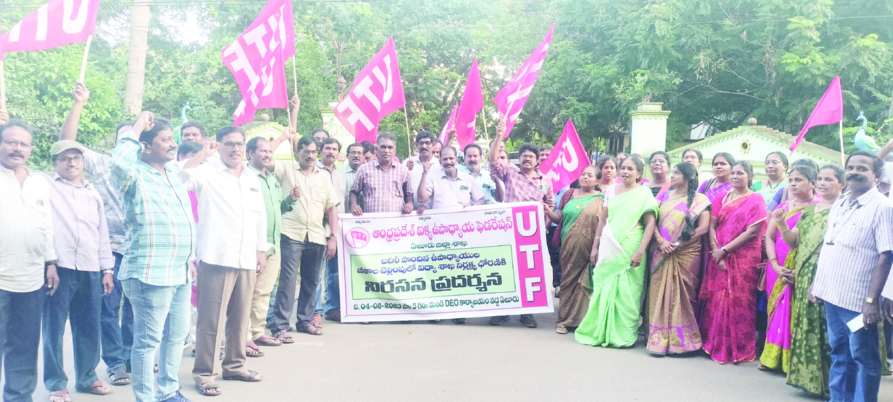 బదిలీలై జీతాలు రాని ఉపాధ్యాయులకు వెంటనే జీతాలు చెల్లించాలని డిమాండ్ చేస్తూ శుక్రవారం సాయంత్రం యుటిఎఫ్ ఆధ్వర్యంలో స్థానిక డిఇఒ కార్యాలయం వద్ద ధర్నా నిర్వహించారు. రెండు నెలల క్రితం ప్రభుత్వం నిర్వహించిన బదిలీల కౌన్సెలింగ్ వల్ల రాష్ట్రవ్యాప్తంగా వేలాదిమంది ఉపాధ్యాయులకు ఇప్పటికీ జీతాలు చెల్లించకపోవడం విద్యాశాఖ వైఫల్యమని యుటిఎఫ్ నాయకులు అన్నారు. పిజిటిలుగా బదిలీ పొందిన ఉపాధ్యాయులకు, పోస్టులు సర్దుబాటు వల్ల బదిలీ పొందిన ఉపాధ్యాయులకు, కొన్ని పాఠశాలలకు కొత్తగా హెచ్ఎం పోస్టులు ఇవ్వడం వల్ల కొంతమంది ఉపాధ్యాయులకు, అలాగే కొన్ని ఉన్నత పాఠశాలల్లో డ్రాయింగ్ ఆఫీసర్ లేక వంటి కారణాలతో జిల్లాలో సుమారు 200 మంది వరకు జీతాలు అందక తీవ్ర ఇబ్బందులు పడుతున్నారని తెలిపారు. చాలామంది ఉపాధ్యాయులు పిల్లల చదువుల కోసం, బ్యాంకుల్లో తీసుకున్న ఇంటి రుణాల కోసం ఇబ్బంది పడుతున్నారని ఆవేదన వ్యక్తం చేశారు. వెంటనే సమస్యలు పరిష్కరించి జీతాలు చెల్లించాలని డిమాండ్ చేశారు. ఈ నిరసనలో రాష్ట్ర కార్యదర్శి బి.సుభాషిణి, జిల్లా అధ్యక్ష, కార్యదర్శులు ముస్తఫా ఆలీ, రవికుమార్, జిల్లా కోశాధికారి జివి.రంగమోహన్, ఆడిట్ కన్వీనర్ మోహన్రావు, జిల్లా కార్యదర్శులు సుధారాణి, రాంబాబు, ఉపాధ్యాయులు పాల్గొన్నారు.