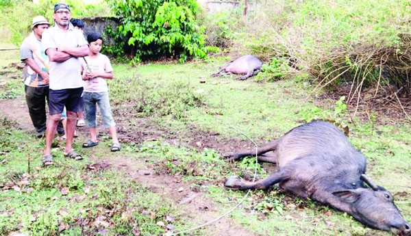 శుక్రవారం ఉరుములు కూడి భారీ వర్షం కారణంగా పిడుగు పడి విద్యుత్ వైర్లు తెగి, విద్యుదాఘాటానికి గురై రెండు పాడి గేదెలు మృత్యువాత పడ్డాయి. జీకే వీధి మండలం సీలేరు కన్నబ్బాయి క్యాంపులో నివాసముంటున్న సియంది గోవిందరాజు తన పాడి గేదులను సీలేరు ఐటిఐ వెనుక భాగంలో మేతకు తోలాడు. శుక్రవారం మధ్యాహ్నం పెద్ద పెద్ద ఉరుములతో పడిన పిడుగు ఈస్టర్న్ పవర్ డిస్ట్రిబ్యూషన్ కంపెనీ డిస్కం లైన్ 250 ట్రాన్స్ఫార్మర్ ఎల్టి లైన్ విద్యుత్ తీగలపై పడి వైర్లు తెగిపడ్డాయి. ఆ సమీపంలో మేస్తున్న రెండు పాడి గేదులకు తెగిన విద్యుత్ తీగలకు తాకడంతో ఆ గేదెలు అక్కడికక్కడే మృతి చెందాయి. అటుగా వస్తున్న ఓ యువకుడు గేదెలు మృత్యువాత గురైనట్లు గుర్తించి పశువులు యజమానికి సమాచారం అందించారు. గోవిందరాజు కుటుంబ సభ్యులతో సంఘటన ప్రదేశాన్ని చేరుకుని మృతి చెందిన రెండు పాడి గేదెలను చూసి బోరున విలపించాడు. రెండింటి విలువ లక్షా 20 వేల రూపాయలు ఉంటుందని బాధిడుతు తెలిపారు. పాలమ్ముకొని తమ కుటుంబం జీవిస్తుందని, గేదెలు చనిపోవడంతో జీవనాధారం పోయిందని, ప్రభుత్వమే తమను ఆర్థికంగా ఆదుకోవాలని గోవిందరాజు కోరారు.