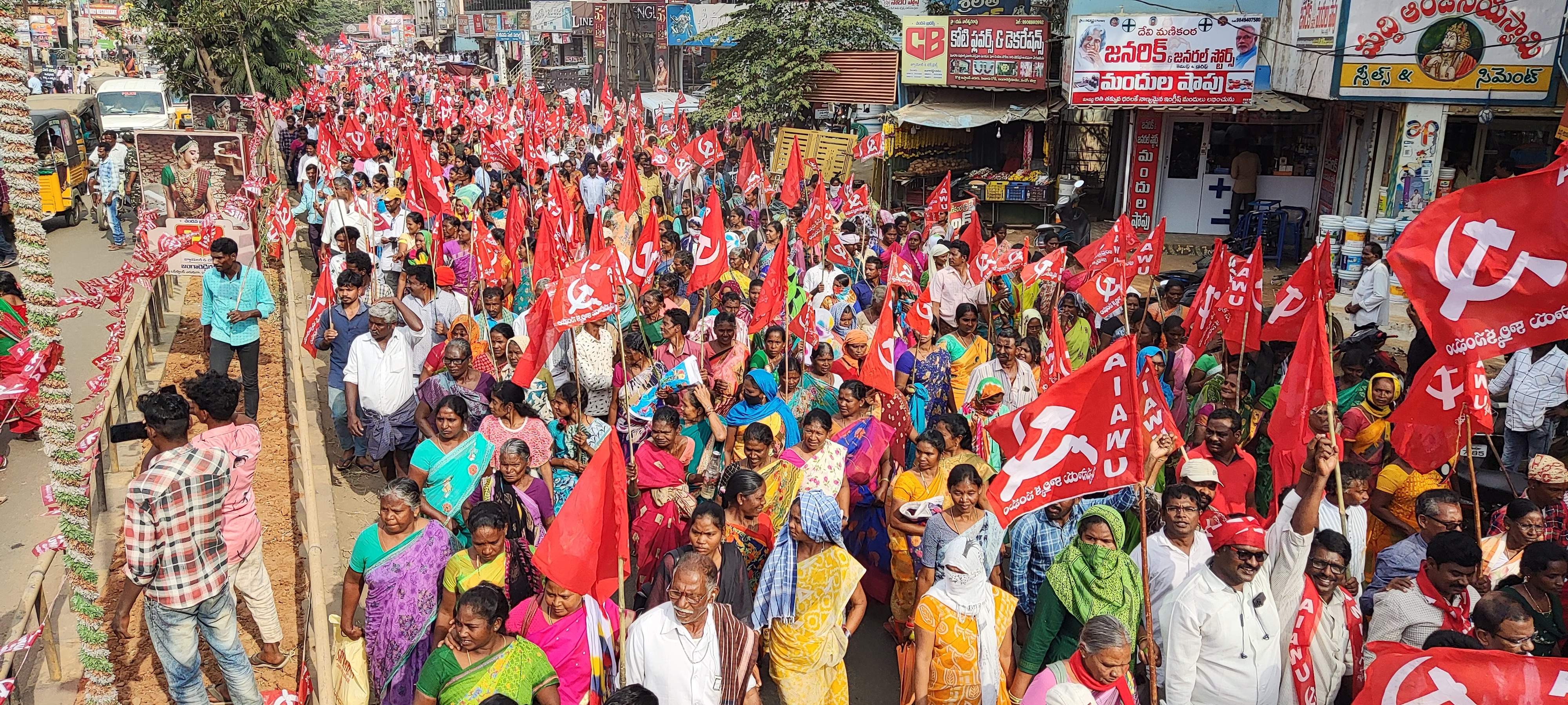 వ్యవసాయ కార్మిక సంఘం 29వ రాష్ట్ర మహాసభ గురువారం ఏజెన్సీ ముఖద్వారం జంగారెడ్డిగూడెంలో అట్టహాసంగా ప్రారంభమయ్యాయి. మధ్యాహ్నం రెండు గంటలకు మార్కెట్ యార్డ్ నుంచి బస్టాండ్ వరకూ భారీ ప్రదర్శన సాగింది. ఈ ప్రదర్శనలో గిరిజనోద్యమ నేత జాతీయ నాయకురాలు బృందాకరత్, వ్యవసాయ కార్మికసంఘం ఆఖిల భారత అధ్యక్షులు ఎ.విజయరాఘవన్, జాతీయ కార్యదర్శి బి.వెంకట్, రూరళ వ్యవసాయ కార్మిక సంక్షేమ బోర్డు ఛైర్మన్ చందన్, పిడిఎఫ్ ఎంఎల్సిలు ఇళ్ల వెంకటేశ్వరరావు, షేక్ సాబ్జీ, వ్యవసాయ కార్మిక సంఘ రాష్ట్ర ప్రధాన కార్యదర్శి వి.వెంకటేశ్వర్లు, పూర్వపు రాష్ట్ర కార్యదర్శి మంతెన సీతారాం, ఆహ్వన సంఘం ప్రధాన కార్యదర్శి ఎ.రవి, వ్యకాస జిల్లా కార్యదర్శి పివి.రామకృష్ణ, రైతు సంఘం జిల్లా కార్యదర్శి కె.శ్రీనివాస్, సిఐటియు జిల్లా అధ్యక్ష ప్రధాన కార్యదర్శులు ఆర్.లింగరాజు, డిఎన్విడి.ప్రసాద్, వ్యకాస నేతలు తామా ముత్యాలమ్మ, ఎం.జీవరత్నం, గిరిజన సంఘం జిల్లా నేత తెల్లం రామకృష్ణష్ణతోపాటు, పలవురు నేతలు, వేలాది మంది జనం పాల్గొన్నారు. ఈ ప్రదర్శనలో అంతా ఎర్రజెండాలు చేతబూనడంతో జంగారెడ్డిగూడెం ప్రాంతమంతా అరుణారుణమైంది. వేలాది మంది నినాదాలతో పట్టణమంతా మార్మోగింది. బస్టాండ్ సమీపంలో కుంజా బొజ్జి, సున్నం రాజయ్య స్మారక ప్రాంగణంలో నిర్వహించిన బహిరంగ సభకు వేలాది మంది వ్యవసాయ కూలీలు, గిరిజనులు విచ్చేశారు. తొలుత నెల్లూరు జిల్లా అలగానిపాడు నుంచి తీసుకొచ్చిన అమరవీరుల జ్యోతిని బృందాకరత్కు, ఎర్రకాల్వ మిగులు భూముల పోరాట నేతలు తీసుకొచ్చిన జ్యోతిని విజయ రాఘవన్కు అందజేశారు. ఈ సందర్భంగా ముఖ్య వ్యక్త బృందాకరత్ కేంద్ర, రాష్ట్ర ప్రభుత్వాలు పేదలు, వ్యవసాయ కార్మికుల పట్ల వ్యవహరిస్తున్న తీరుపై తీవ్ర విమర్శలు గుప్పించారు. అఖిల భారత వ్యవసాయ కార్మిక సంఘం జాతీయ అధ్యక్షులు విజయ రాఘవన్ మాట్లాడుతూ చంద్రబాబు అమరావతి అని, జగన్ మూడు రాజధానులు అని అనడం తప్ప పేదల భూముల గురించి ఇరువురు మాట్లాడరని విమర్శించారు. వాస్తవ పరిస్థితులను పరిశీలిస్తే పేదల జీవితాలు దుర్బరంగా మారు తున్నాయని, భూములు లేని పేదలు అధిక సంఖ్యలో ఉన్నారని చెప్పారు. దేశంలో 60 శాతం జనాభాకు భూమి లేదని, కేంద్ర, రాష్ట్ర ప్రభుత్వాలు వారికి భూమిచ్చేందుకు సహకరిం చడం లేదని అన్నారు. మోడీ ప్రభుత్వం ఉపాధి హామీ చట్టాన్ని నీరుగారుస్తోందన్నారు. రైతులు, కార్మికులు అంతా కలిసి పోరాడితేనే సమస్యలు పరిష్కారమవుతాయని అన్నారు.