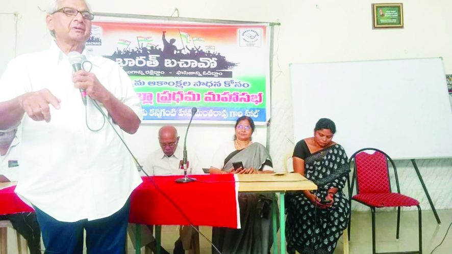 పల్నాడు జిల్లా: రానున్న ఎన్నికల్లో మతతత్వ పార్టీలను ఓడించాలని జనవిజ్ఞాన వేదిక రాష్ట్ర వ్యవస్థాపక అధ్యక్షులు డాక్టర్ బ్రహ్మారెడ్డి పిలుపు నిచ్చారు. నరసరావుపేటలోని కృష్ణవేణి మహిళా డిగ్రీ కళాశాలలో శనివారం భారత్ బచావో మొదటి జిల్లా మహాసభ జరిగింది. సమావేశానికి భారత బచావో రాష్ట్ర ఆర్గనైజింగ్ కార్యదర్శి కె.నవజ్యోతి అధ్యక్షత వహించారు. ఈ సందర్భంగా బ్రహ్మారెడ్డి మాట్లాడుతూ దేశంలో నేడు మతోన్మాద ఫాసిస్టు బిజెపి ప్రభుత్వం కొద్ది మంది కార్పొరేట్ శక్తులకు లాభాలు చేకూరుస్తూ దేశంలో 80 శాతం మంది ప్రజలను మరింత పేదరికంలోకి నెట్టి వేస్తోందని విమర్శించారు. బిజెపిని ప్రశ్నిస్తున్న మేధా వులు, హక్కుల , ప్రజాసంఘాల నాయకులపై నిర్బంధ ఉపా చట్టం మోపి జైలు పాలు చేస్తోందని మండిపడ్డారు. ఈ నిర్బంధాలకు, దోపిడీకి వ్యతిరేకంగా దేశవ్యాప్తంగా ప్రజ లను యువతను ఐక్యం చేసి చైతన్యం నింపి ఉద్యమించా లని పిలుపు నిచ్చారు. పాలస్తీనా పై ఇజ్రా యిల్ దాడులను వెంటనే నిలిపివేయాలని తీర్మానం చేశారు. అనంతరం భారత్ బచావో పల్నాడు జిల్లా నూతన కమిటీని ఏక గ్రీవంగా ఎన్నుకున్నారు. కార్యక్రమంలో భారత బచావో స్టేట్ కౌన్సిల్ సభ్యులు బి. కోటేశ్వరరావు, జి.రత్నం, సీతా మహాలక్ష్మి, అందెశ్రీ, పిడిఎఫ్ రాష్ట్ర నాయ కులు వై.వెంక టేశ్వరరావు,ఎన్.రామారావు తదితరులు పాల్గొన్నారు.