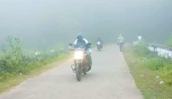 మంచు కారణంగా లైట్లు వేసుకొని ప్రయాణిస్తున్న ద్విచక్ర వాహనదారుడు