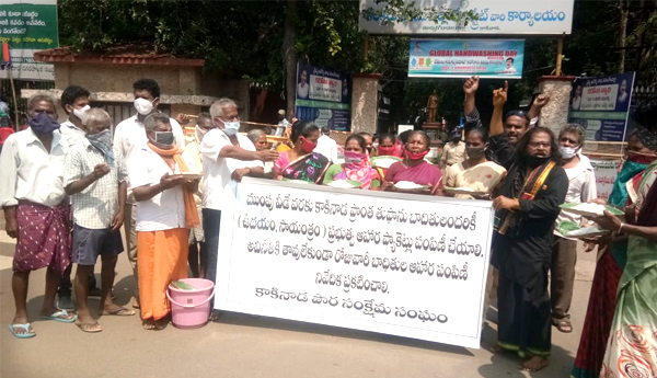 తూర్పు గోదావరి : కాకినాడ వరద బాధితులకు ముంపు వీడేంతవరకూ రెండు పూటలా ఆహారాన్ని ప్రభుత్వం అందించాలని కోరుతూ.. సోమవారం నగర పౌర సంక్షేమ సంఘం ఆధ్వర్యంలో కాకినాడలోని జిల్లా కలెక్టర్ కార్యాలయం ఎదుట ధర్నా నిర్వహించారు. కాకినాడ ప్రాంత తుఫాను బాధితులందరికీ ముంపు వీడేంత వరకూ ప్రతీ రోజు ఉదయం, సాయంత్రం ప్రభుత్వ ఆహార ప్యాకెట్లను పంపిణీ చేయాలని, అవినీతికి తావు లేకుండా రోజువారీ బాధితుల ఆహార పంపిణీ నివేదిక ప్రకటించాలని డిమాండ్ చేశారు.
